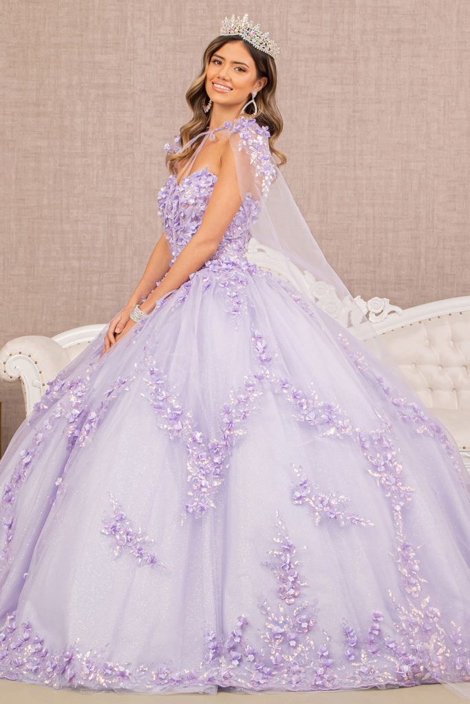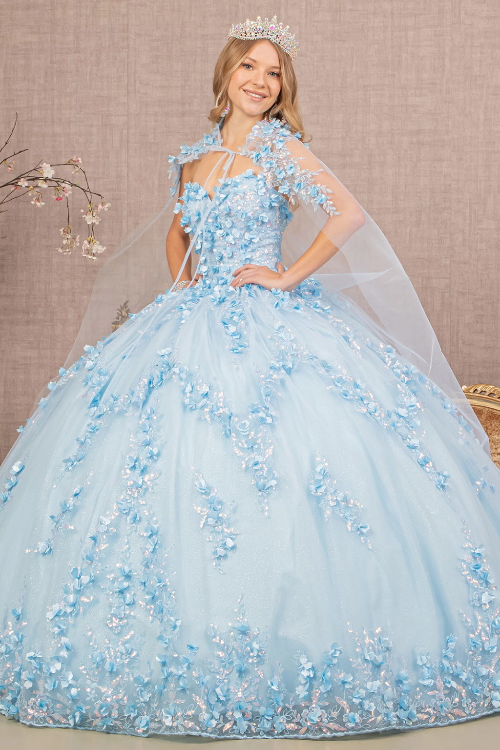 3-D Flower Applique Glitter Quinceanera Gown w/ Mesh Cape