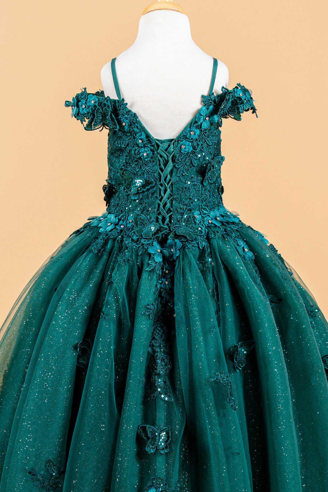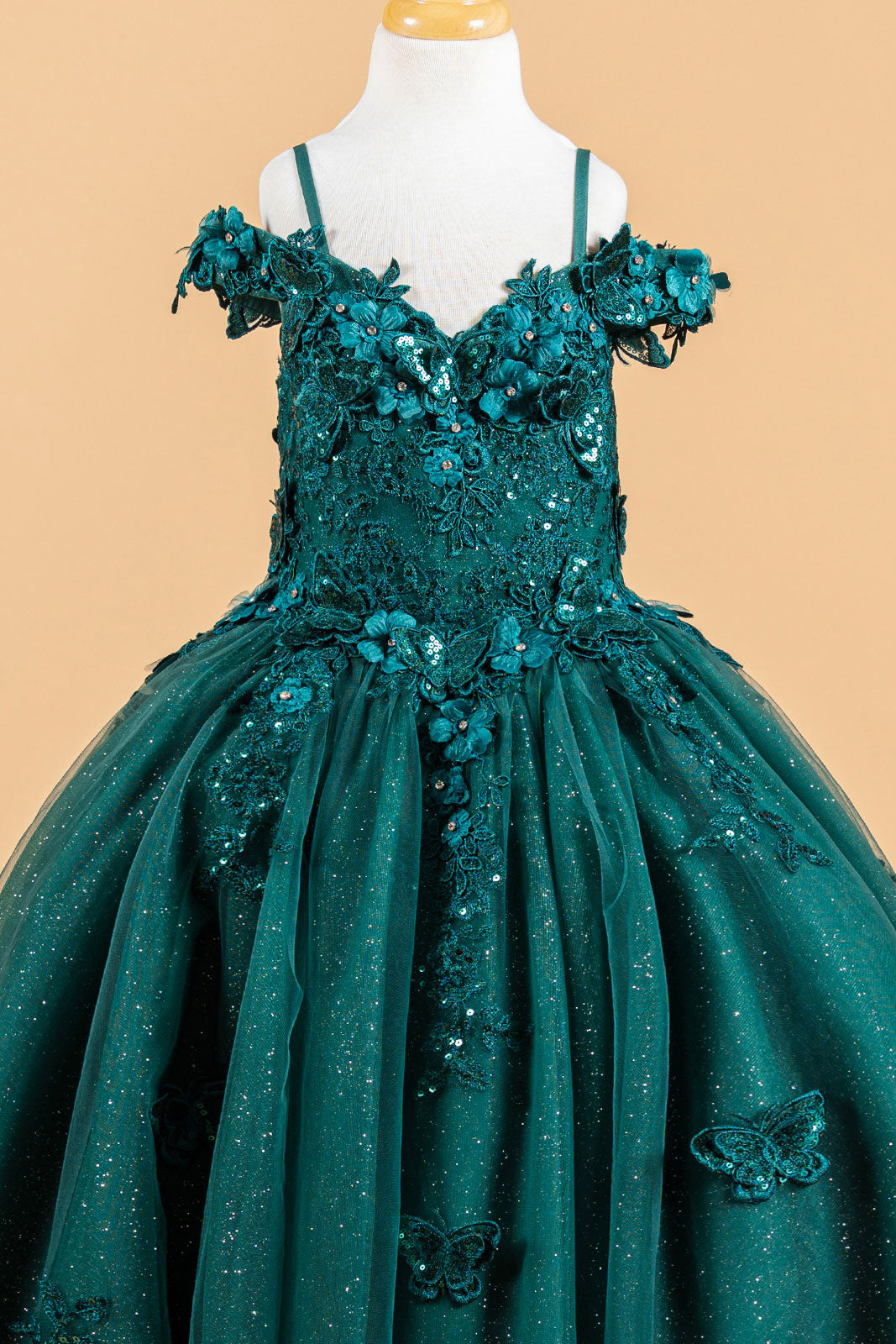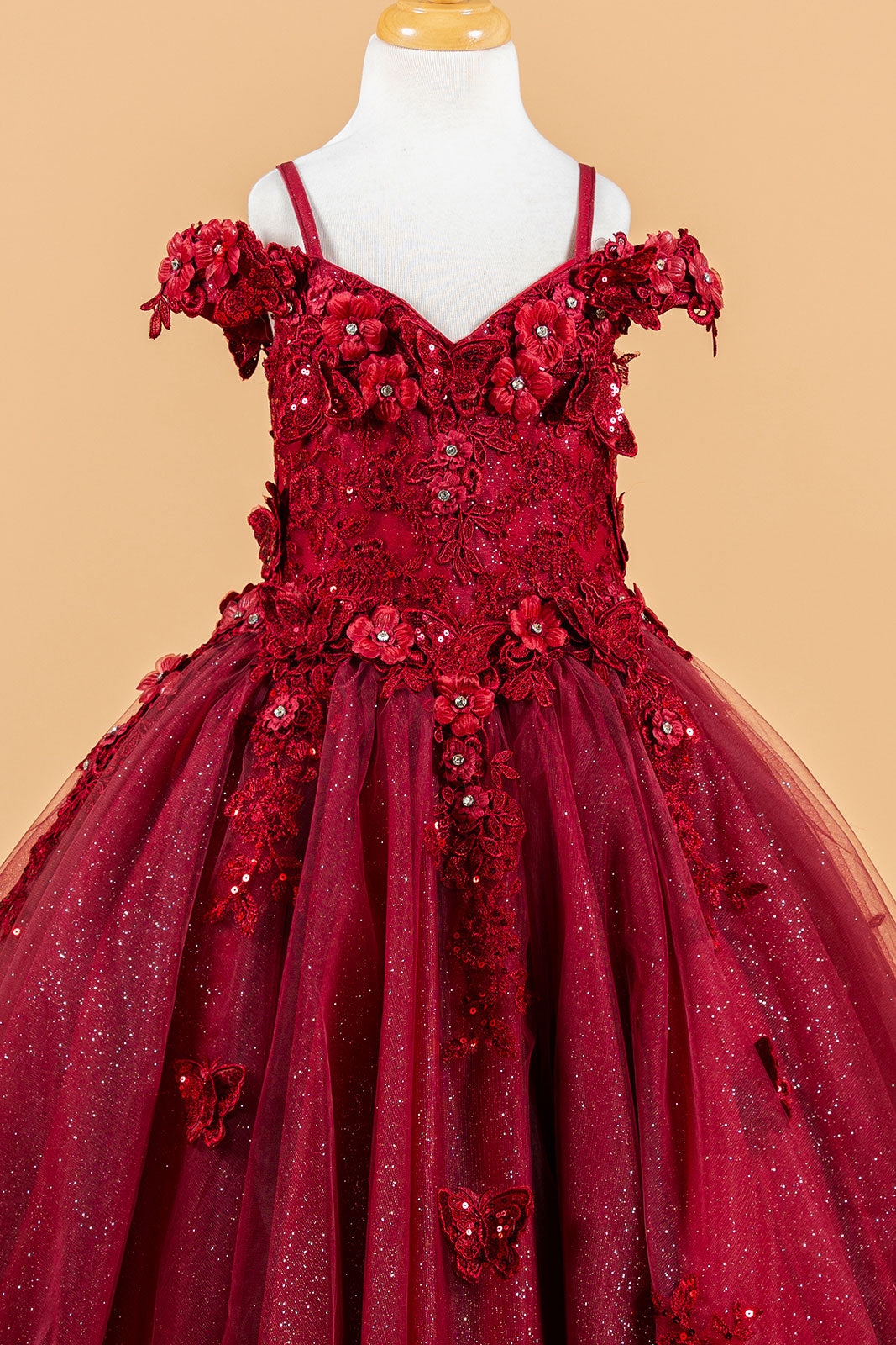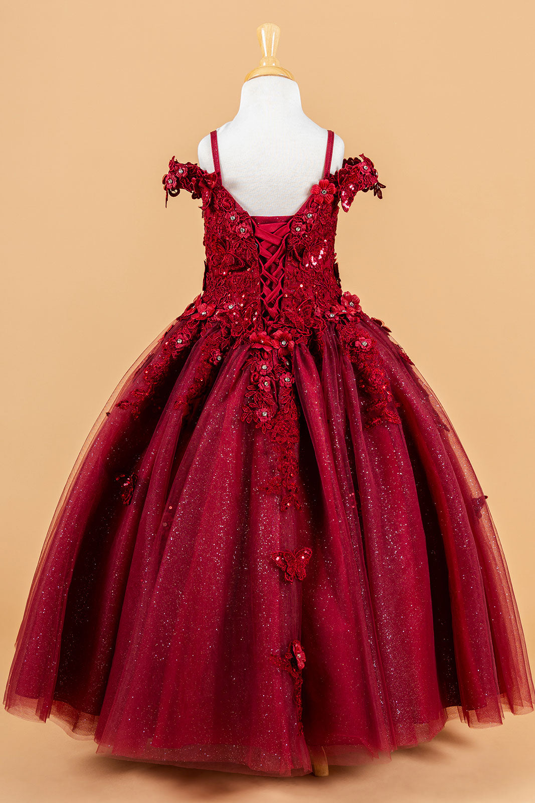 Transform your child into a regal princess with our 3D Flower and Butterfly Applique Cold Shoulder Dress. Adorned with elegant V-Neck, tulle, sequin, and glitter accents, this MyKids-USA™ creation is a masterpiece of embroidery and embellishment. The cut-away shoulder and corset detail add a touch of sophistication to this burgundy ball gown.