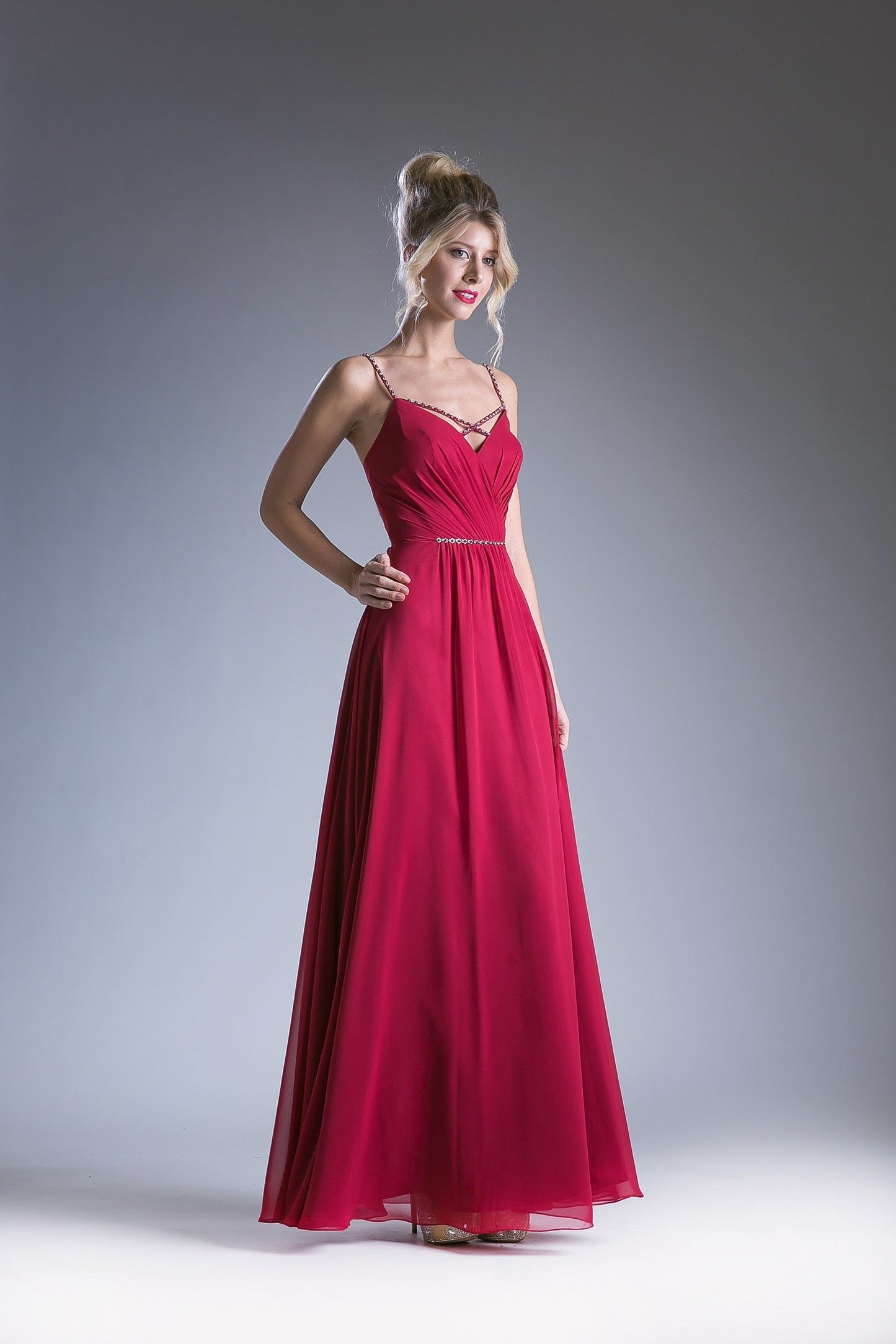 Look sophisticated in this V-neckline dress, detailed with spaghetti straps and crisscross straps on the neckline. The ruched bodice is adorned with a beaded band at the natural waist, with an A-line silhouette and V-strapped back. Perfect for any special occasion.