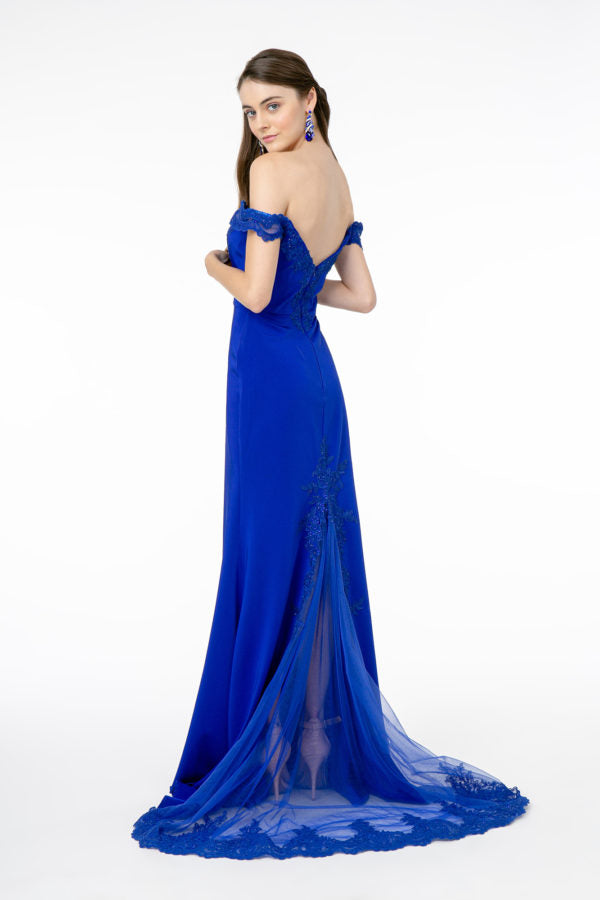 Embroidered Cut-Away Shoulder Jersey Long Dress w/ V-Back