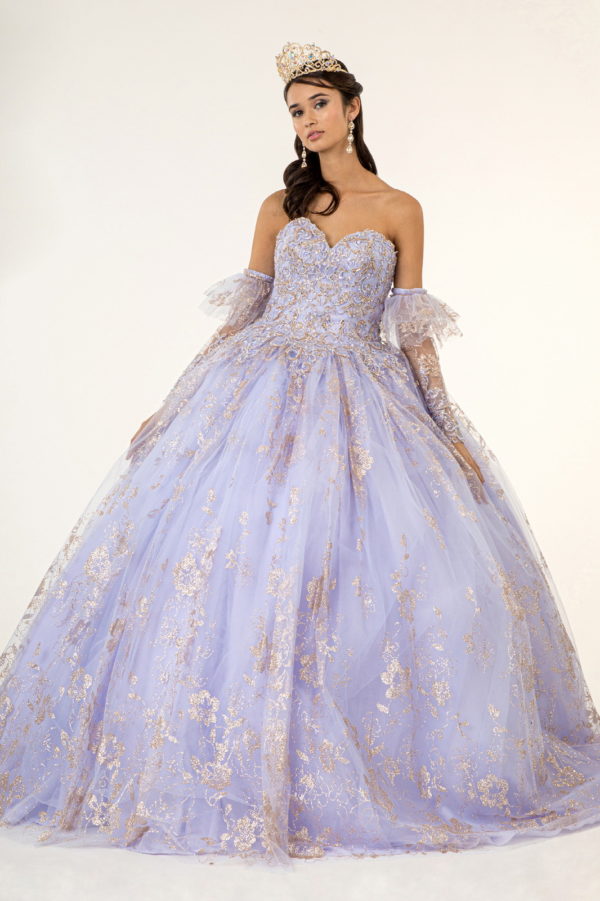 Embroidered Glitter Mesh Quinceanera Dress w/ Detached Long Sleeve