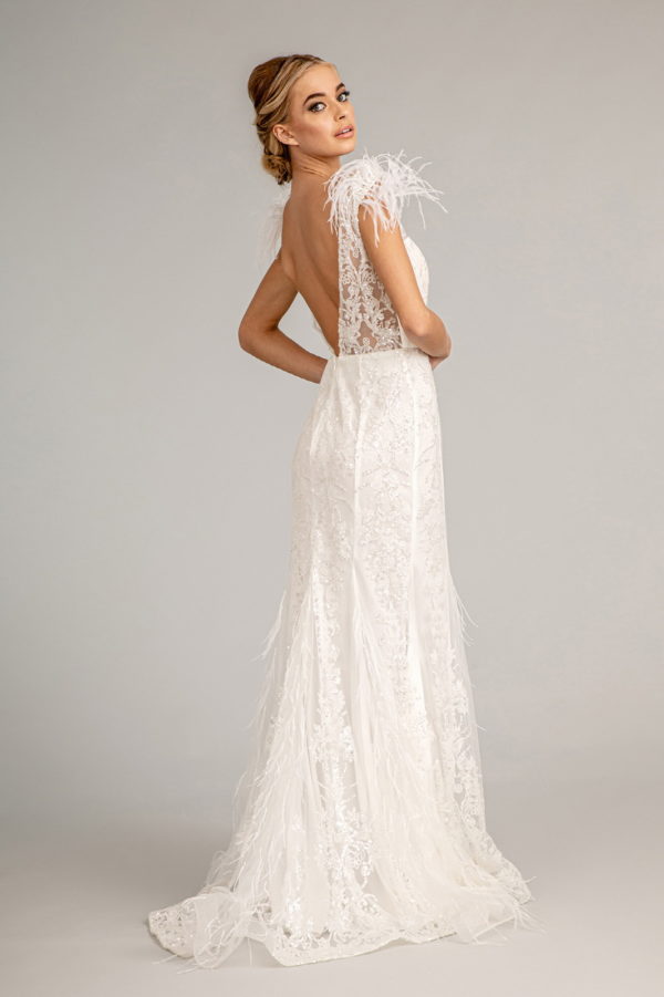 Feather Embellished Sleeveless Glitter Mesh Prom Dress w/ Sheer Back One hot tip for finding a unique dress is to look for unique embellishment: Feathers! This dress features soft feather additions to the straps and skirt which is all you need to make this a show-stopping look. Sparkly sequins adorn this dress from bodice to skirt, and deep illusion sweetheart neckline with sheer back adds a playful touch.