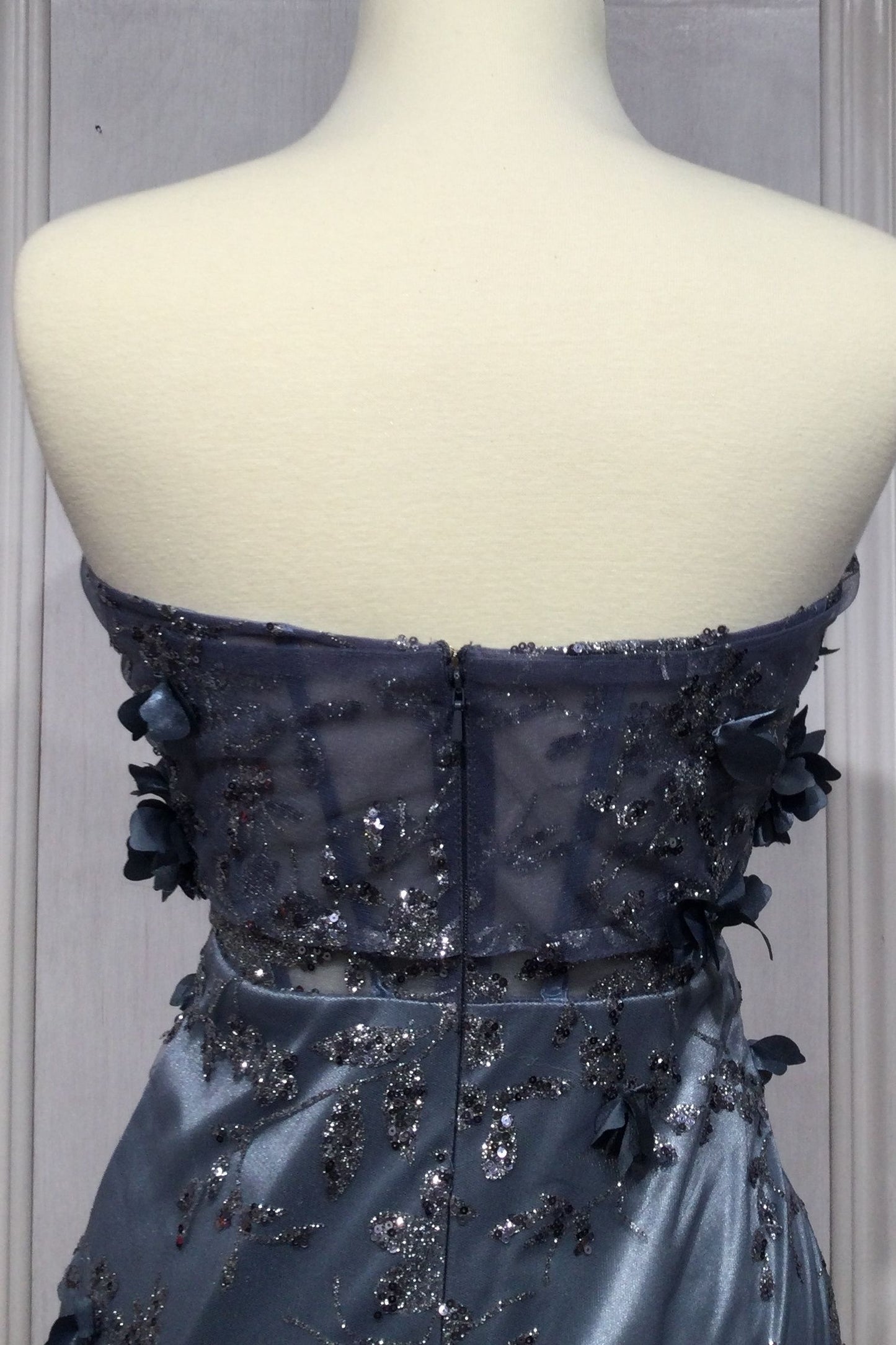 Dress to impress in this gorgeous fitted gown. Crafted from luxuriously tulle fabrics, its off-the-shoulder silhouette adds a touch of finesse and grace. Its sheer boned bodice radiates sophisticated allure, while the center back zipper is practical yet stylish. Take that one step further by revealing a subtle leg slit when you swirl around the dance floor. With its beautiful floral print and timeless shape, you'll be sure to seize the attention at any event. In this versatile gown, you have the perfect combination of sophistication and elegance.