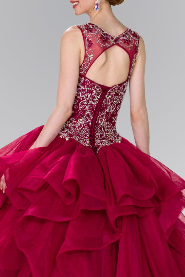 This stunning ball gown features a full beaded bodice and illusion sweetheart neckline for a glamorous and elegant look. The included bolero adds an extra touch of sophistication. Perfect for a formal event or special occasion.
