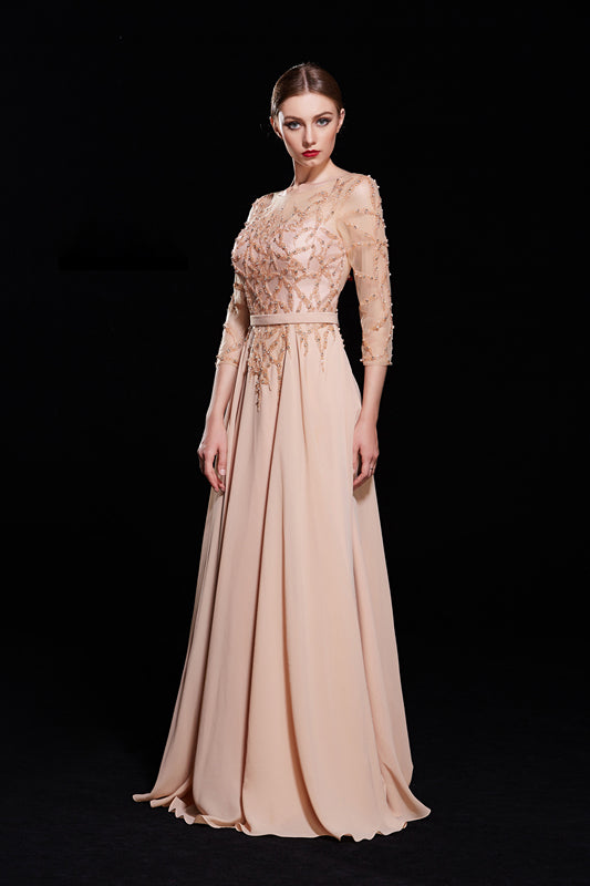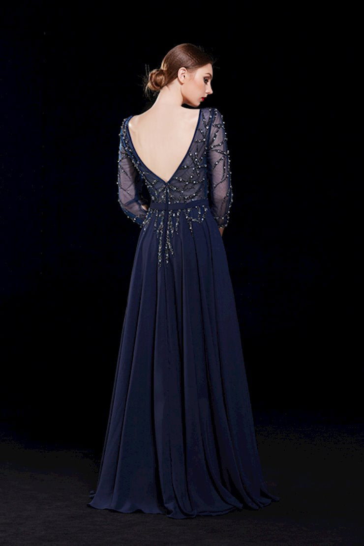Introducing our J12061 dress, made with luxurious navy fabric and designed in an elegant A-line silhouette. The v-neckline and 3/4 sleeves add a touch of sophistication, while the champagne accents add a subtle touch of glamour. Perfect for any occasion, this dress will make you feel confident and stylish.