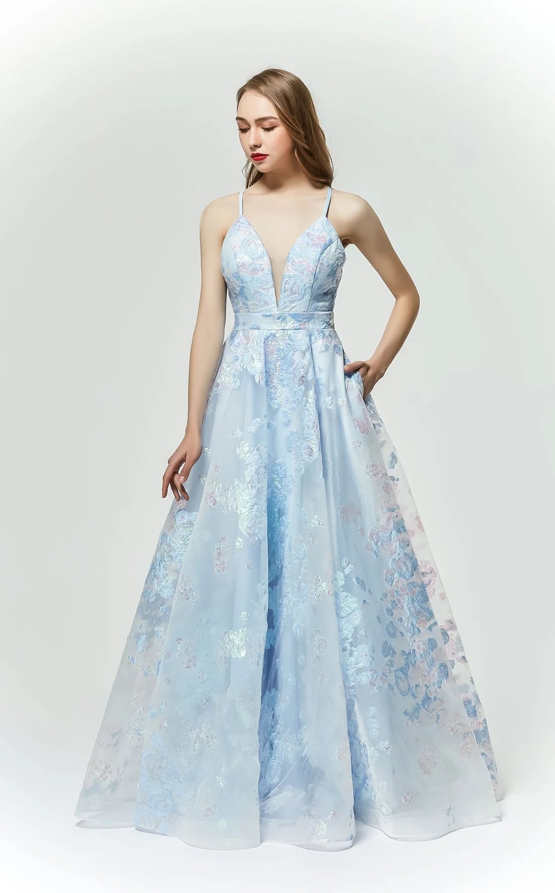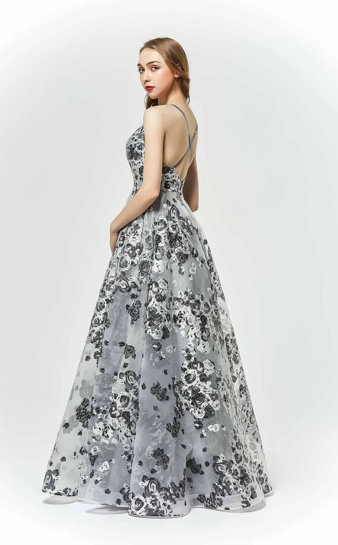 Indulge in the luxurious elegance of our J19007 gown. Featuring a graceful V-neckline and delicate spaghetti straps, this ball gown is perfect for prom or any special occasion. The A-line silhouette, in a stunning blue charcoal hue, will flatter your figure and make you feel like a true work of art.