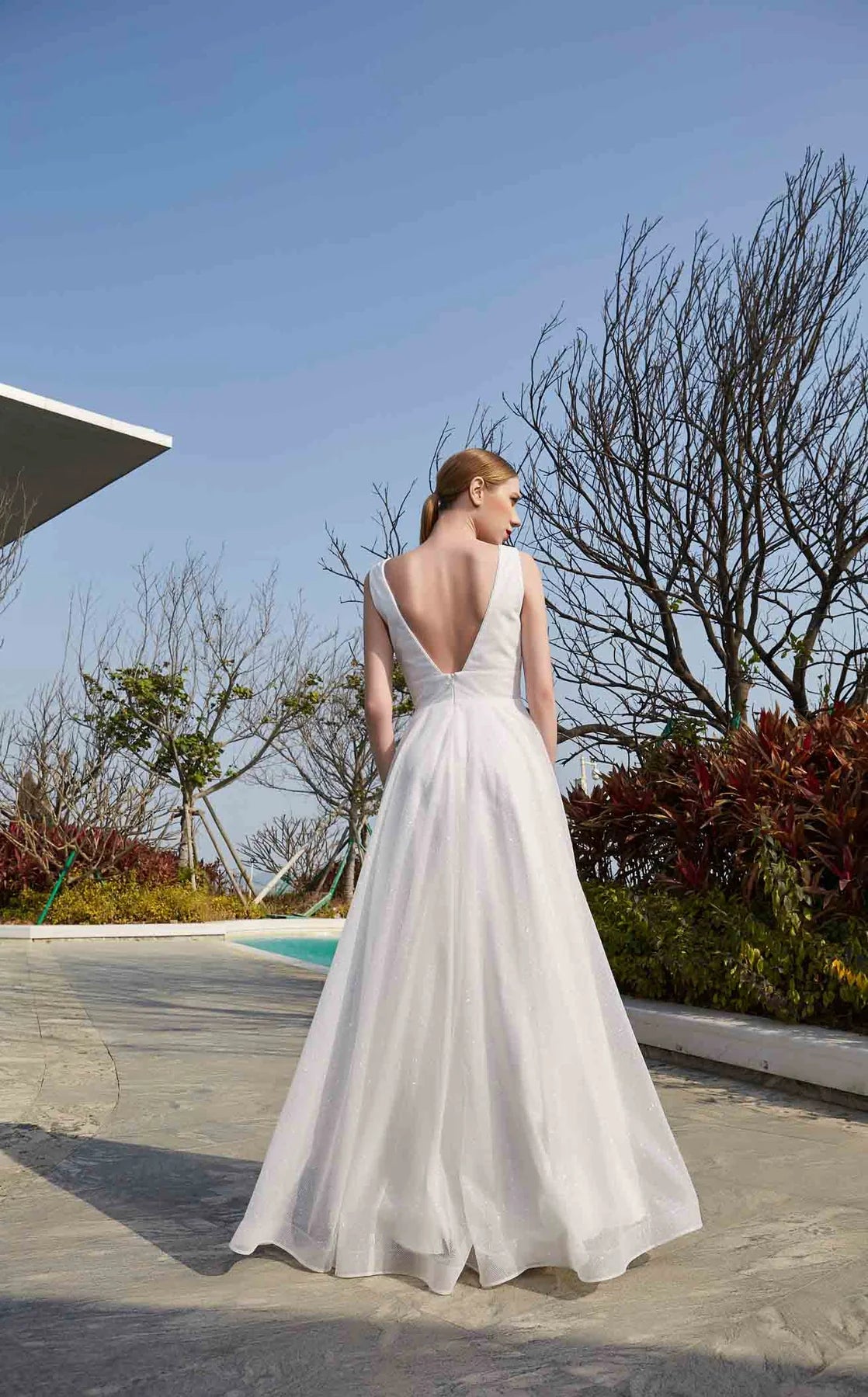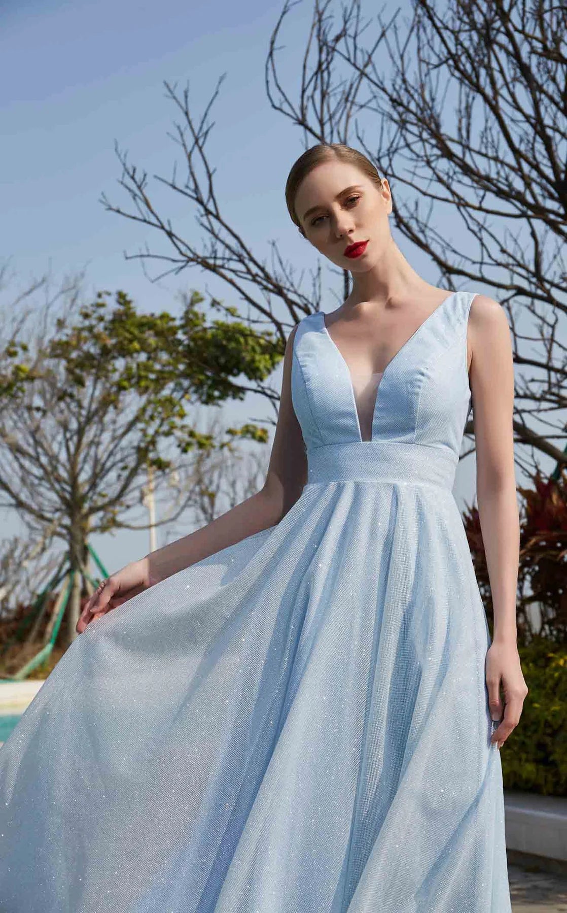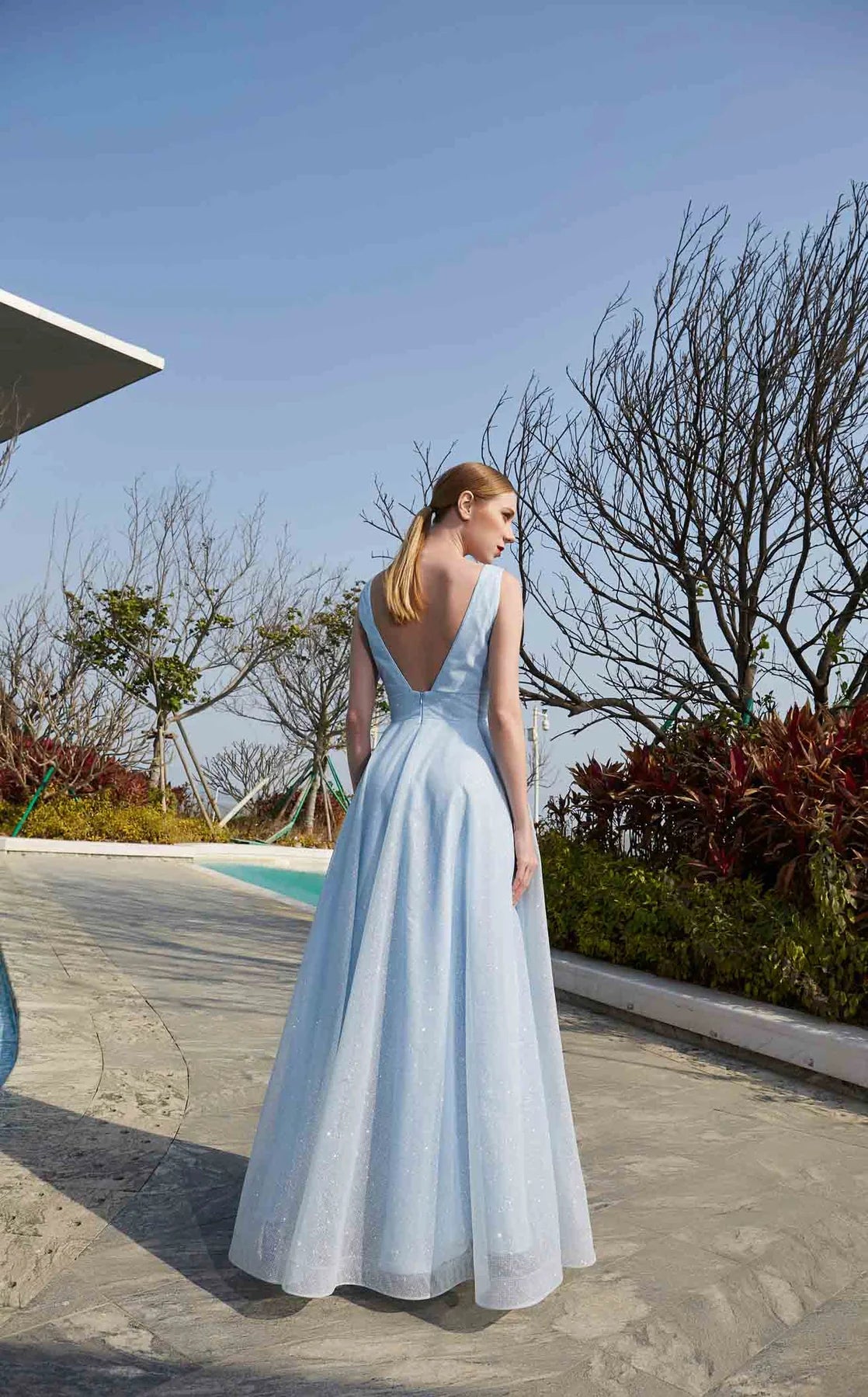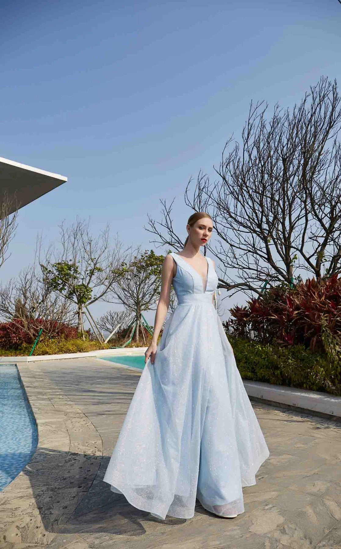 Unleash your inner elegance with our J19014 gown. The V-neckline, delicate A-line silhouette, and luxurious hues of ivory, dove, and lavender exude sophistication and grace. Perfect for prom or any special occasion, this piece is sure to captivate all eyes.