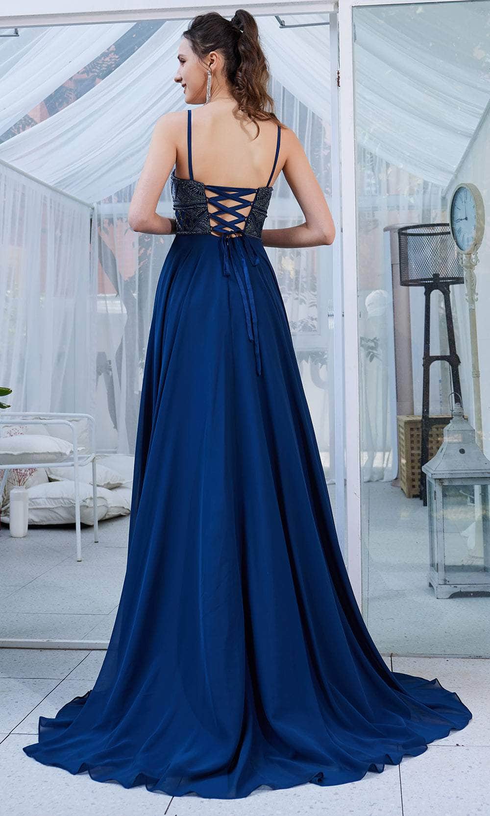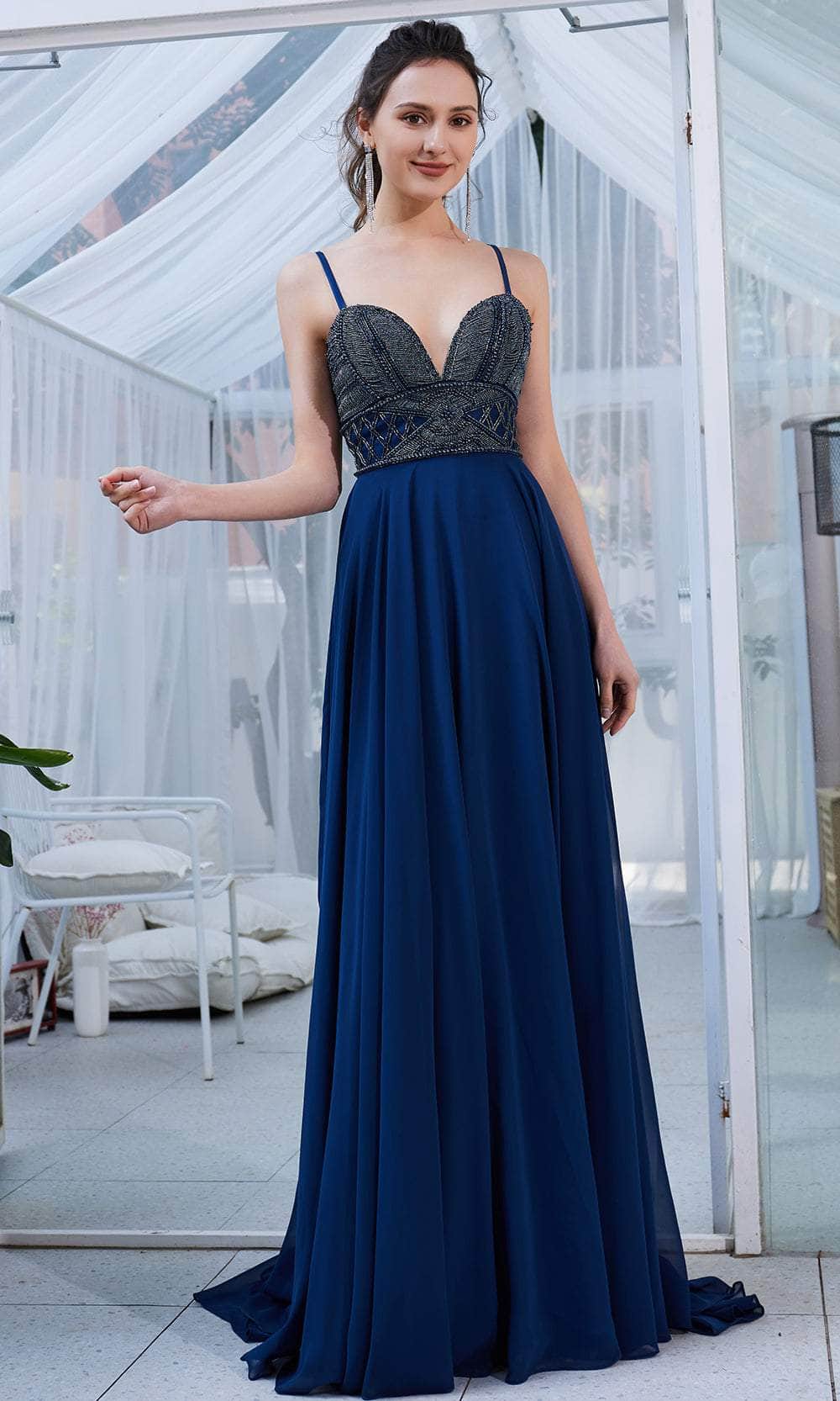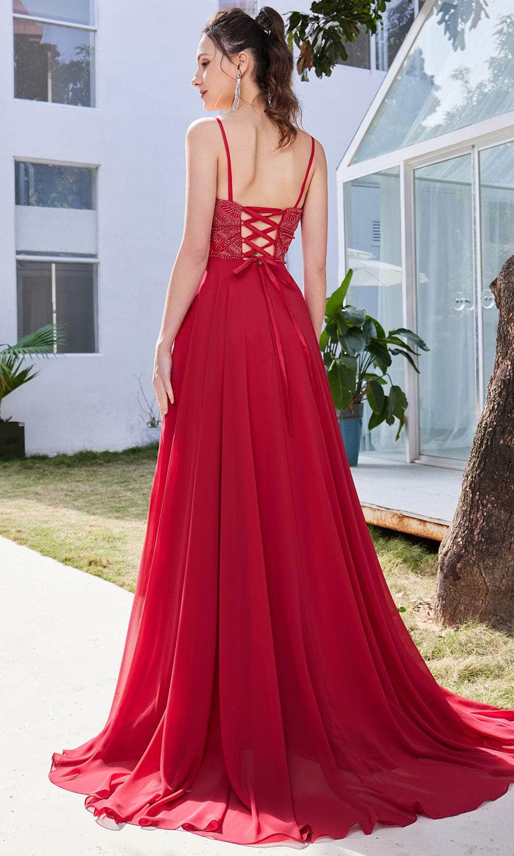 Enter the hall with grace and beauty J21013 creation. Glams in a beaded top bodice, this eye-catching gown features a sleeveless deep sweetheart neckline, wide waistband and spaghetti straps. The mid-open back has a crisscross lace-up tie and zipper closure to ensure a flattering fit. While the skirt is tailored in chiffon fabric that displays a full-length A-line silhouette with soft pleats detail. A beautiful sweeping train finishes this look. This Jadore evening gown will definitely bring out the goddess in you! Models are wearing the Crimson, Ivory and Midnight colors