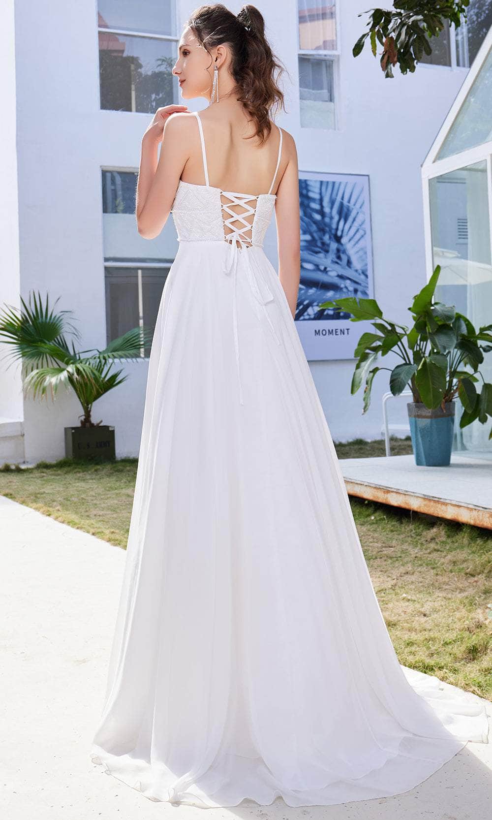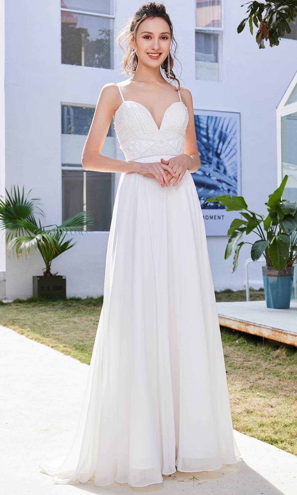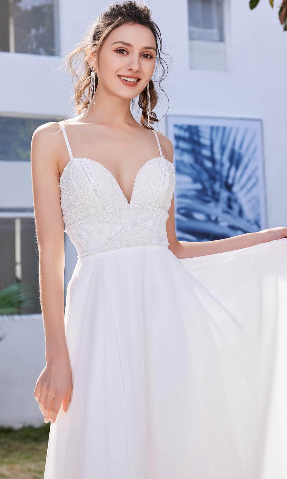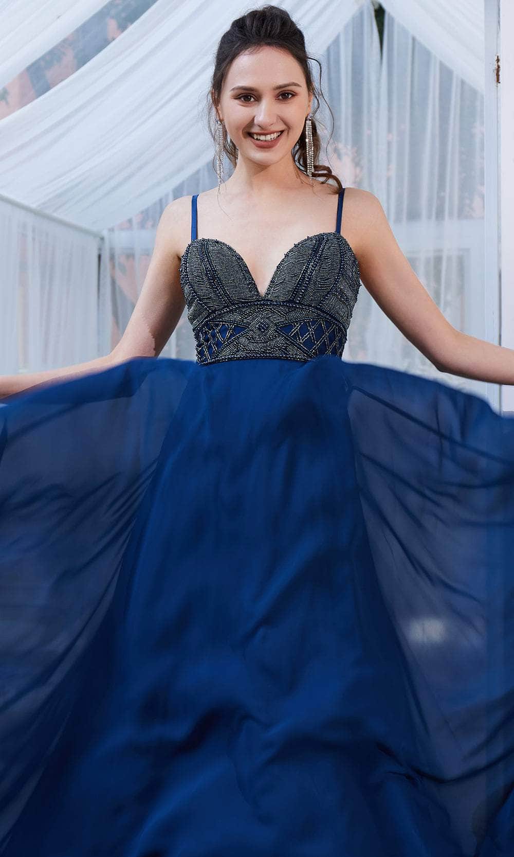 Enter the hall with grace and beauty J21013 creation. Glams in a beaded top bodice, this eye-catching gown features a sleeveless deep sweetheart neckline, wide waistband and spaghetti straps. The mid-open back has a crisscross lace-up tie and zipper closure to ensure a flattering fit. While the skirt is tailored in chiffon fabric that displays a full-length A-line silhouette with soft pleats detail. A beautiful sweeping train finishes this look. This Jadore evening gown will definitely bring out the goddess in you! Models are wearing the Crimson, Ivory and Midnight colors