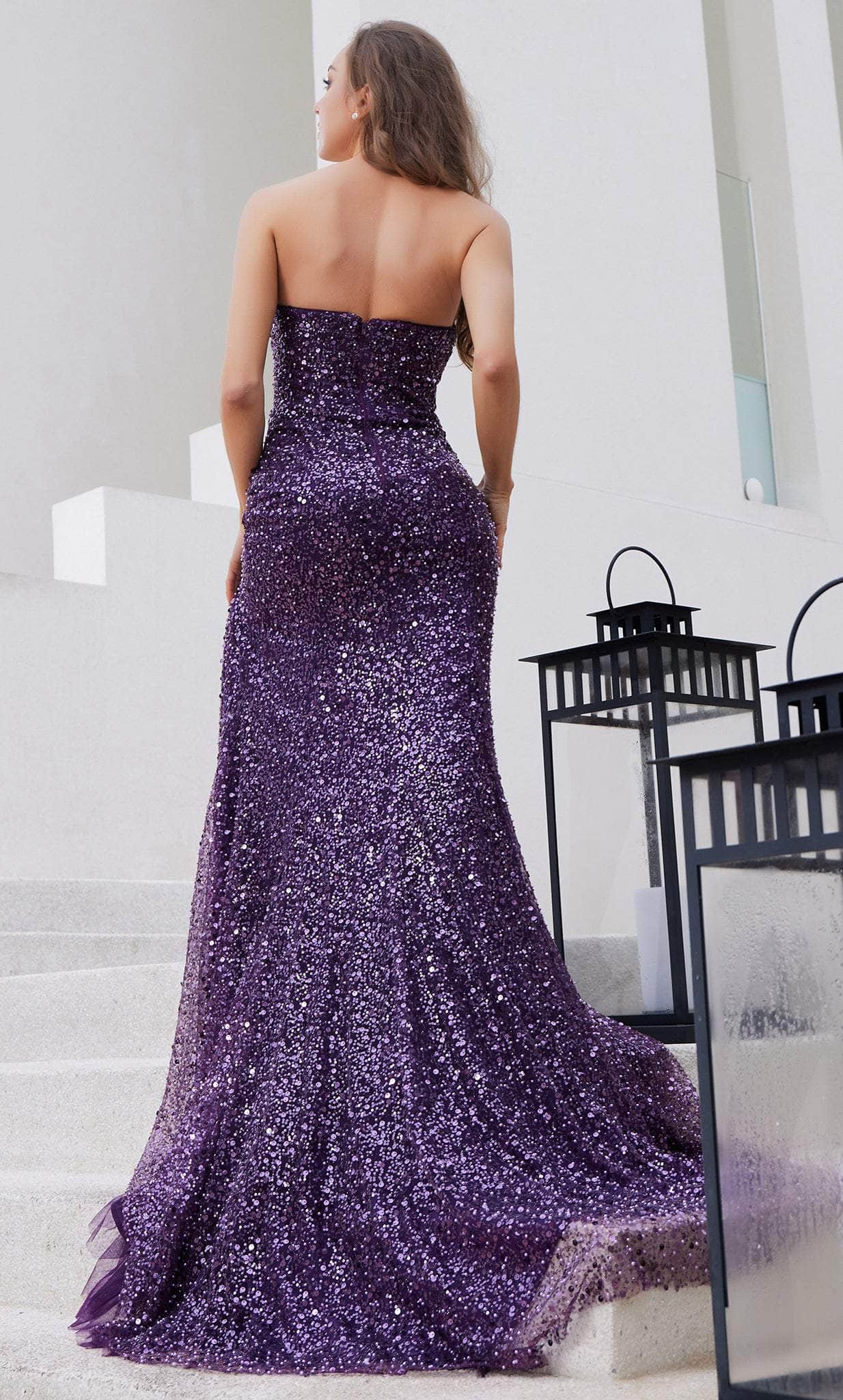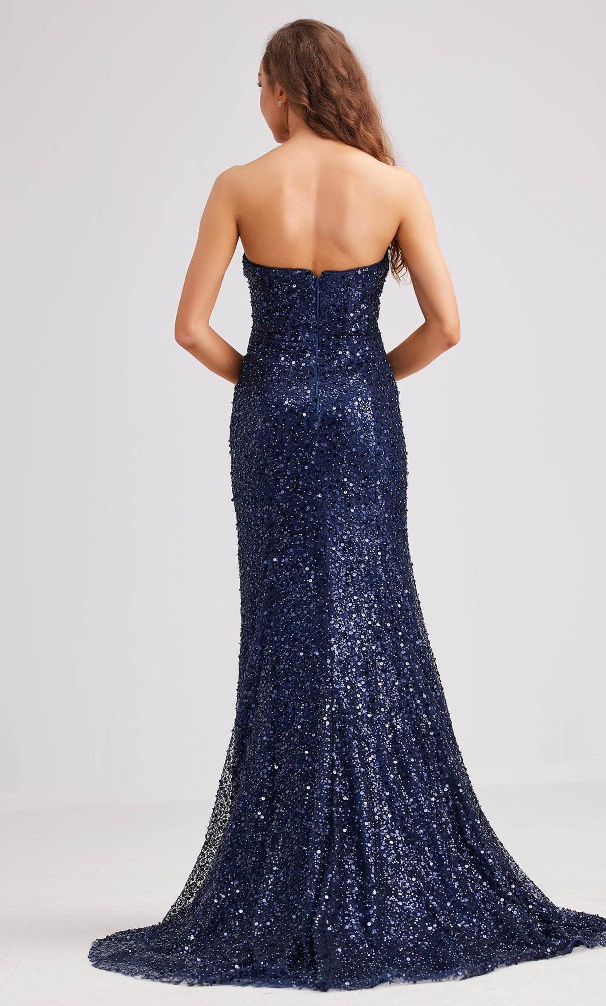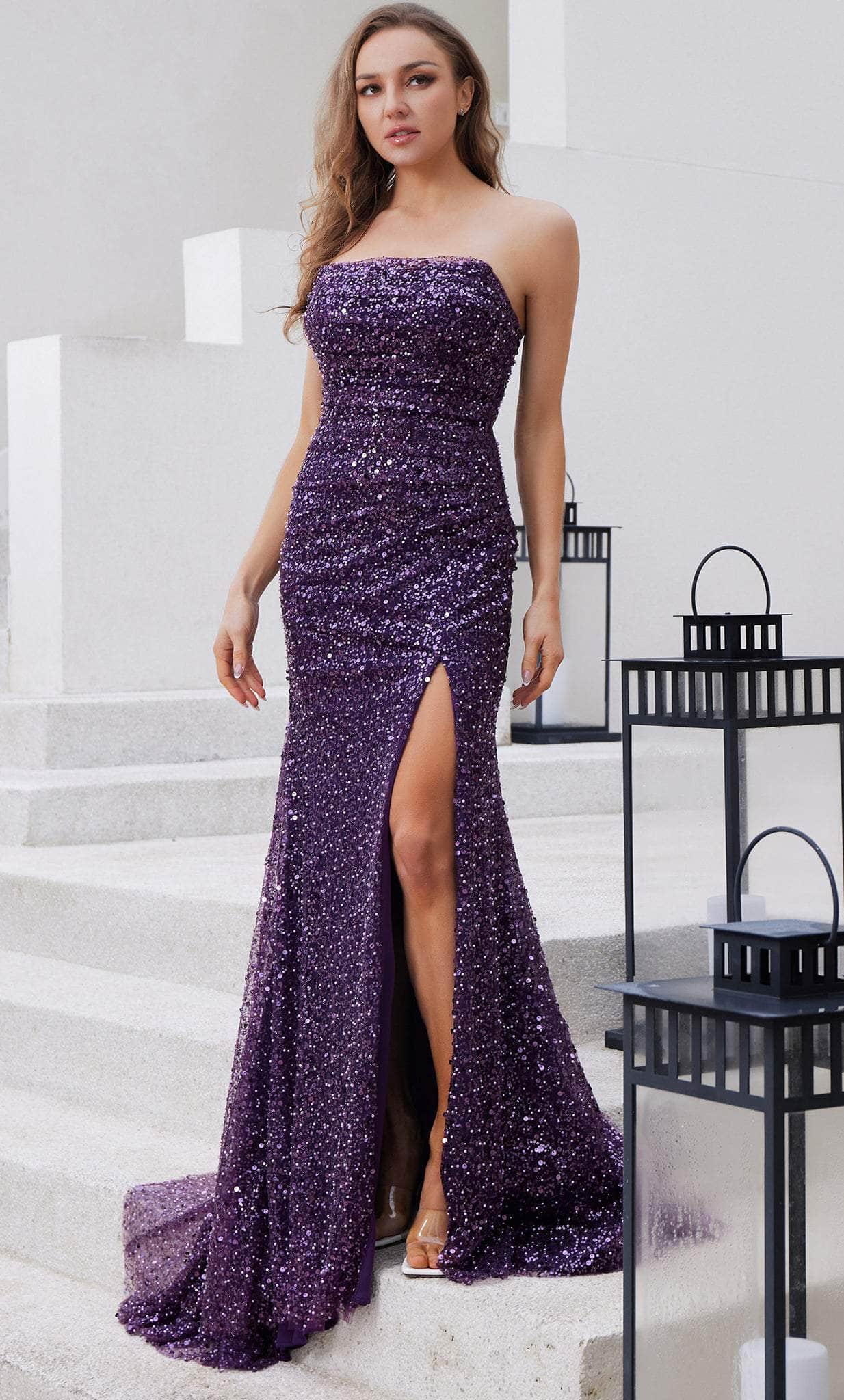 Radiate style eloquence when you arrive at your sumptuous event in this Dresses J23020 creation. Embellished with fine ruching texturizing its figure flattering length, this stunner crafts a straight across neckline with a strapless bodice. Defined with a midrise back and a zipper closure, the sequin ornate ensemble flaunts with a trumpet silhouette with a thigh high slit and a shimmering sweep of train. Glow with opulence while fascinating everyone in this inspired Dresses J23020 masterpiece. Models are wearing the Navy, Purple, and Red colors