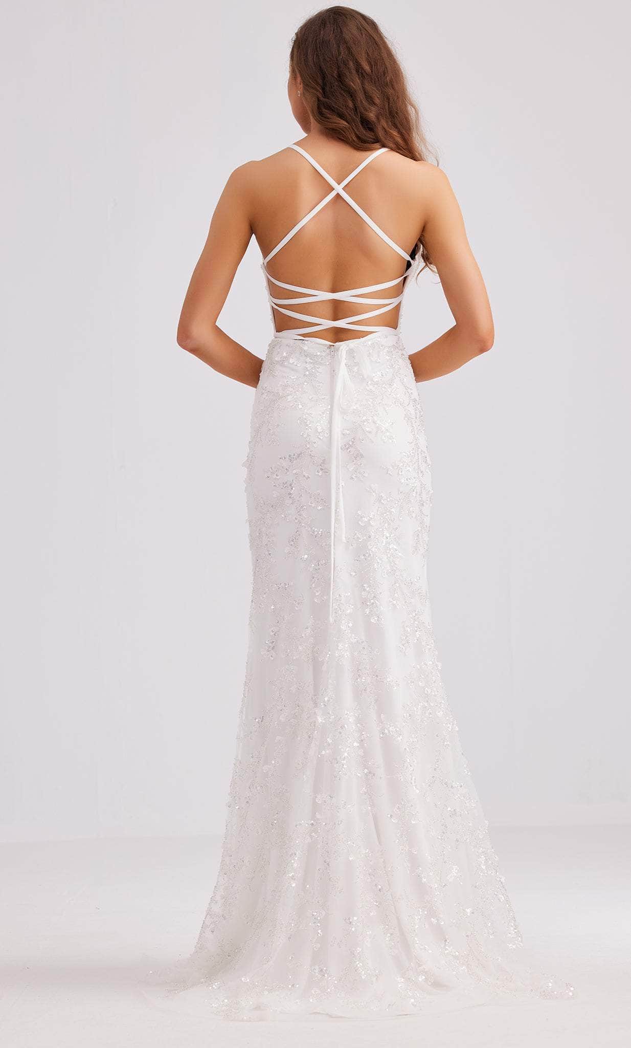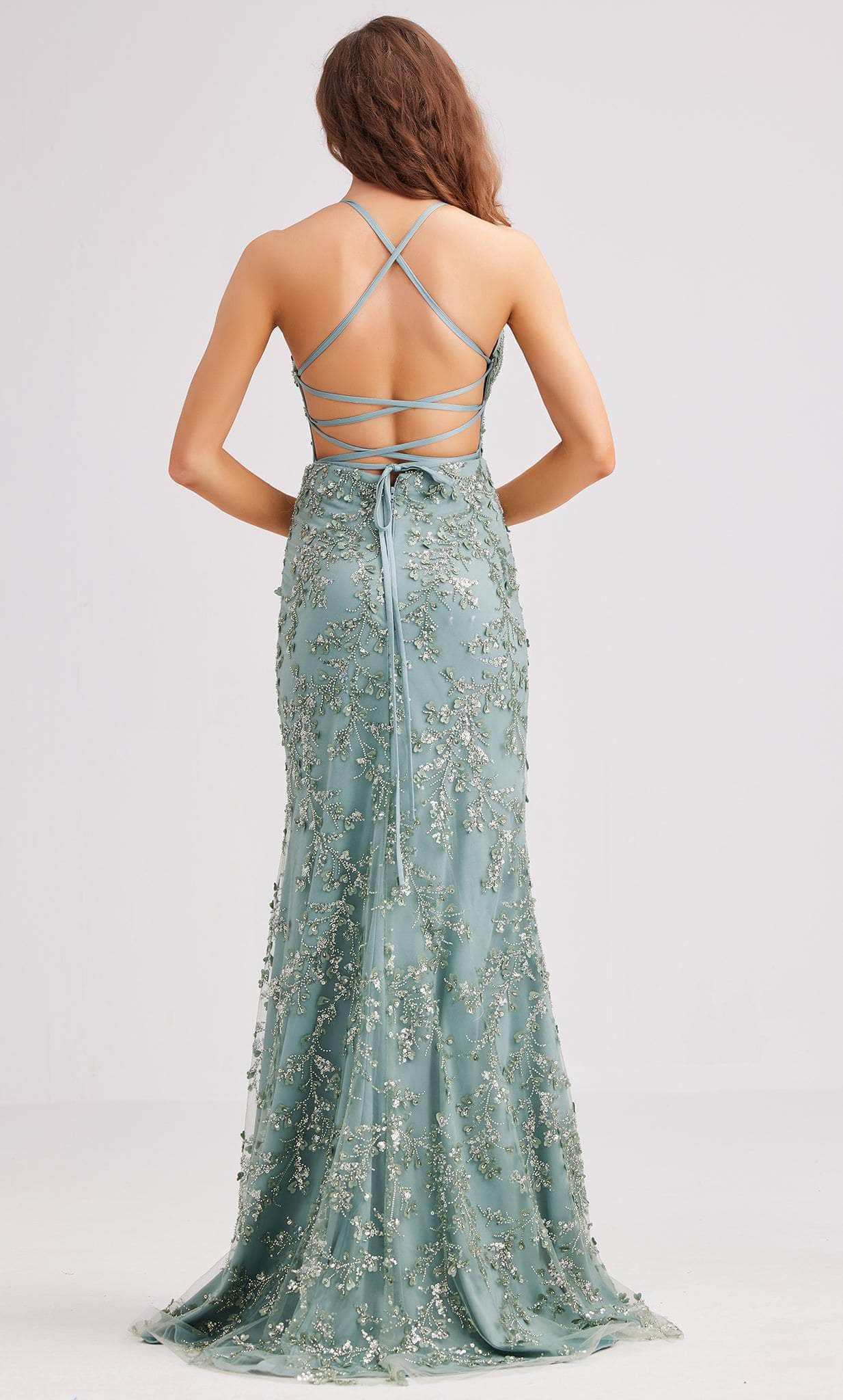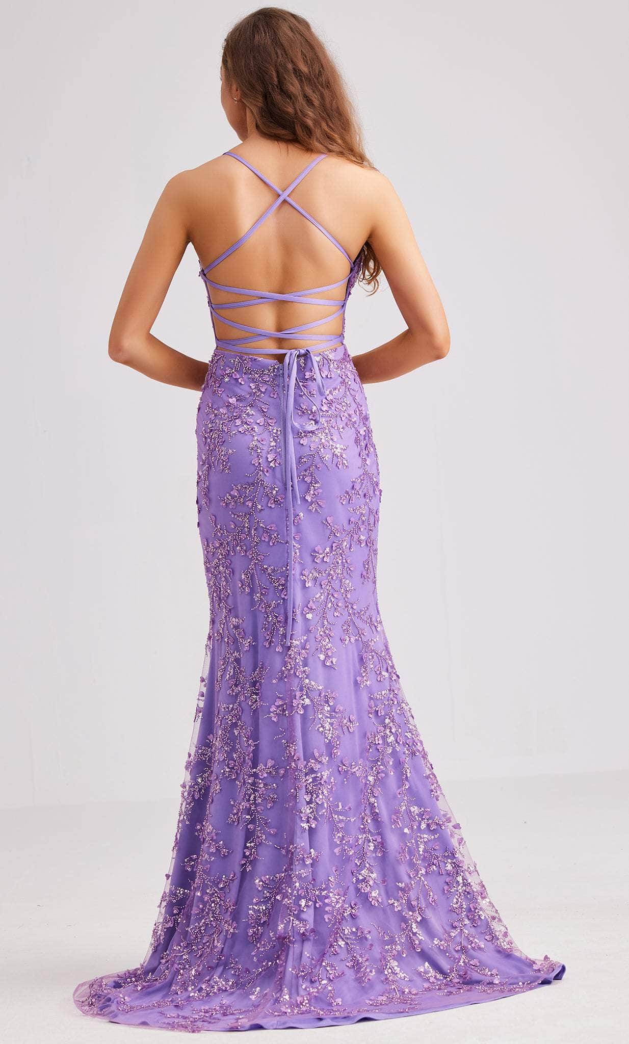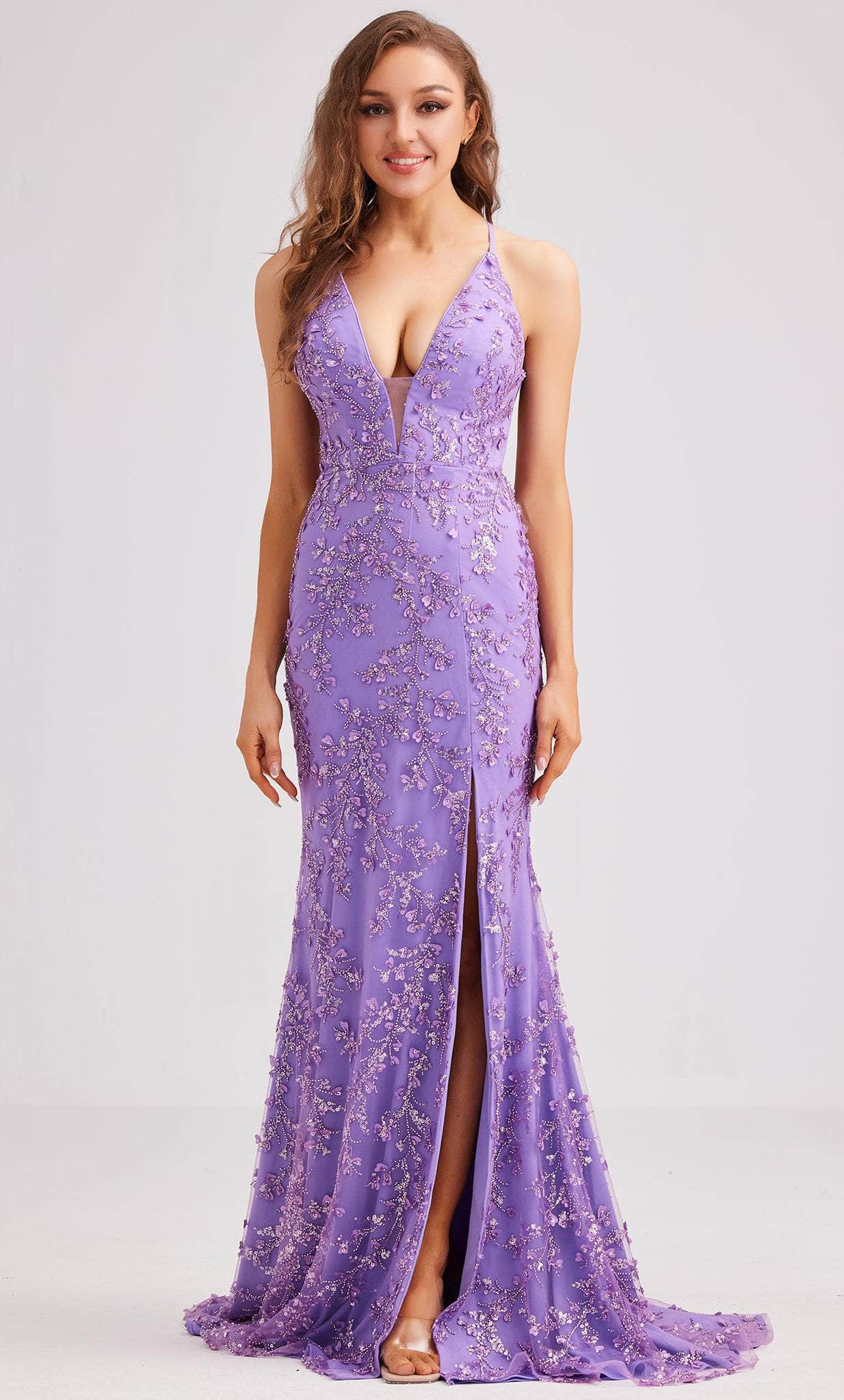 Revel in the timeless and alluring element of this exquisite Dress J23036 creation. Tantalizingly textured with beadwork and dainty floral lace appliques, this gown parades a tailored silhouette with a plunging v-neckline with an illusion inset. Stringed with spaghetti straps and detailed with a lace up accent on an open back, the adorned skirt streams beautifully into a mermaid silhouette with a high slit and a sweeping denouement. Make magic in this refined style that would make you look stunning in this Dress J23036 masterpiece. Models are wearing the Ivory, Purple, and Sage colors.