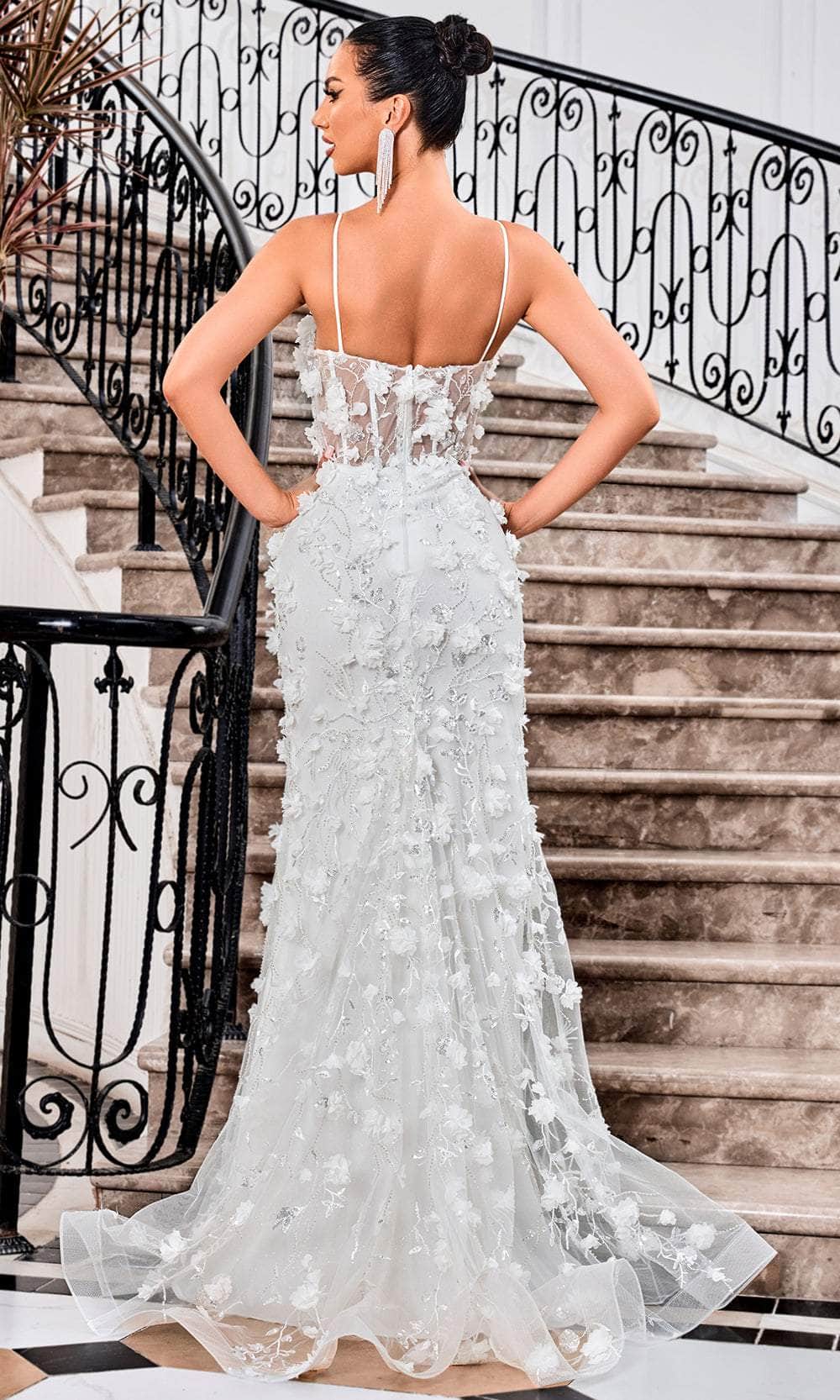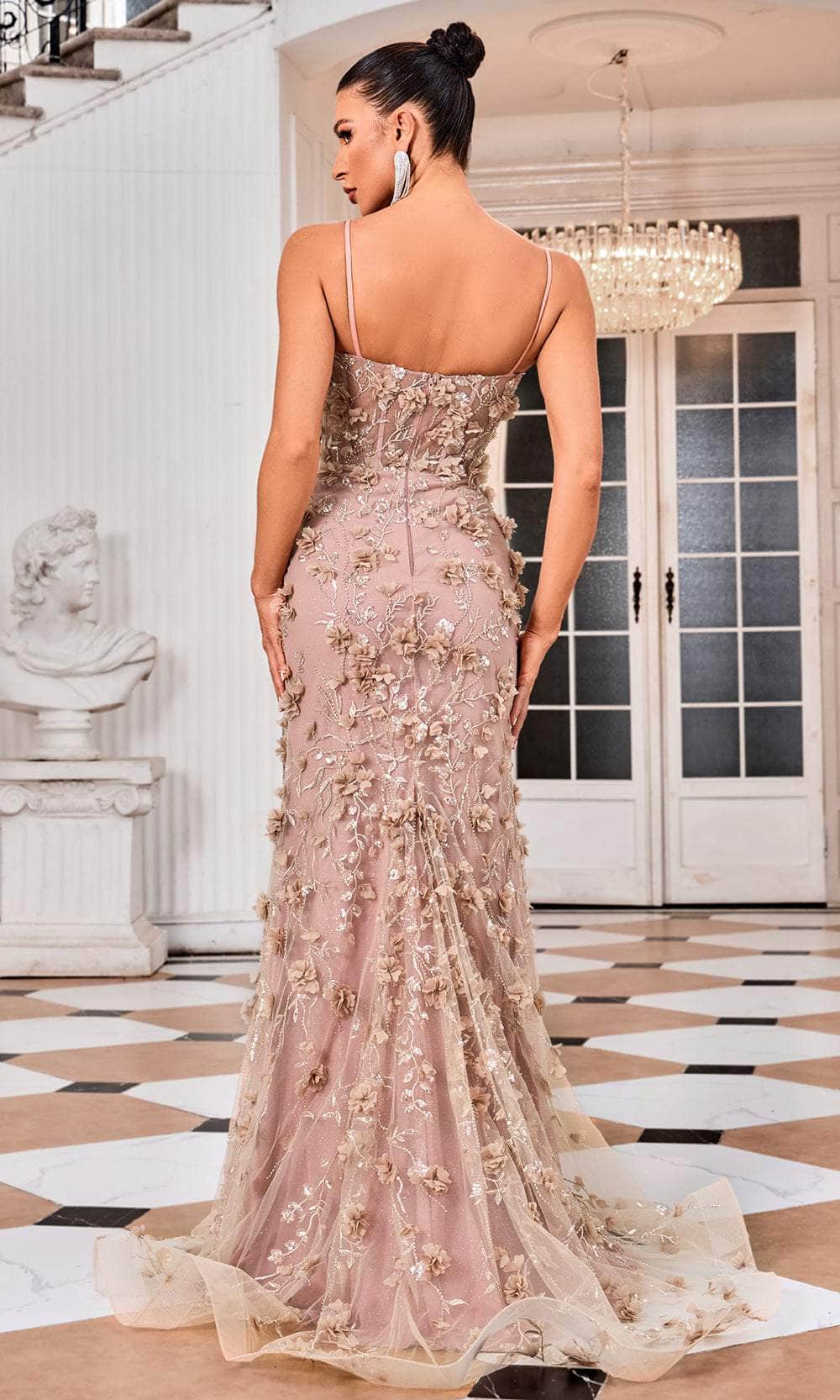 Radiate opulence in the beautifully embellished Dress J24002 creation. With delicate spaghetti straps and a sheer corset bodice donning a sweetheart neckline, it effortlessly exudes timeless allure. The intricate 3D floral elements infuse an ethereal touch, while the sheer back introduces an element of fascination. The gown elegantly descends into a trumpet skirt with a high slit, allowing for graceful movement and a dash of allure. Its trailing train provides a regal finishing touch. Command attention and revel in the spotlight with this exquisitely stunning Dress J24002 masterpiece. Models are wearing the Ivory, Misty Rose, and Sky colors.