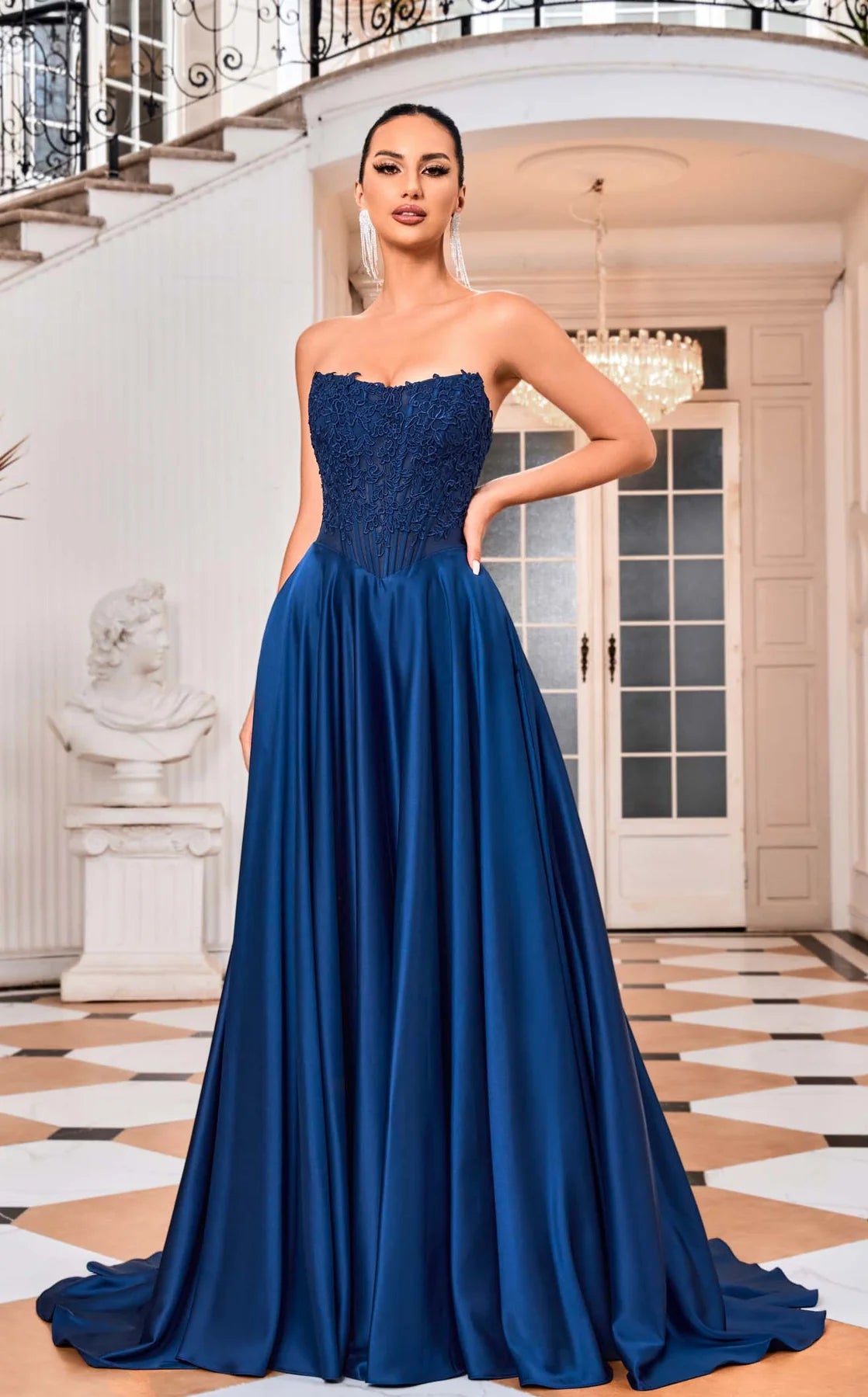 Give others tough competition in this magnificent J24015 gown. The outfit features a sleeveless corset embellished with sheer lacework and a tie-up back. Its basque waistline creates a flattering effect while the A-line skirt flourishes charmingly on the ground. Displaying an iridescent effect and ending with a sweep train, the gown makes your every move count. Available in Red, Navy and Ivory colors.