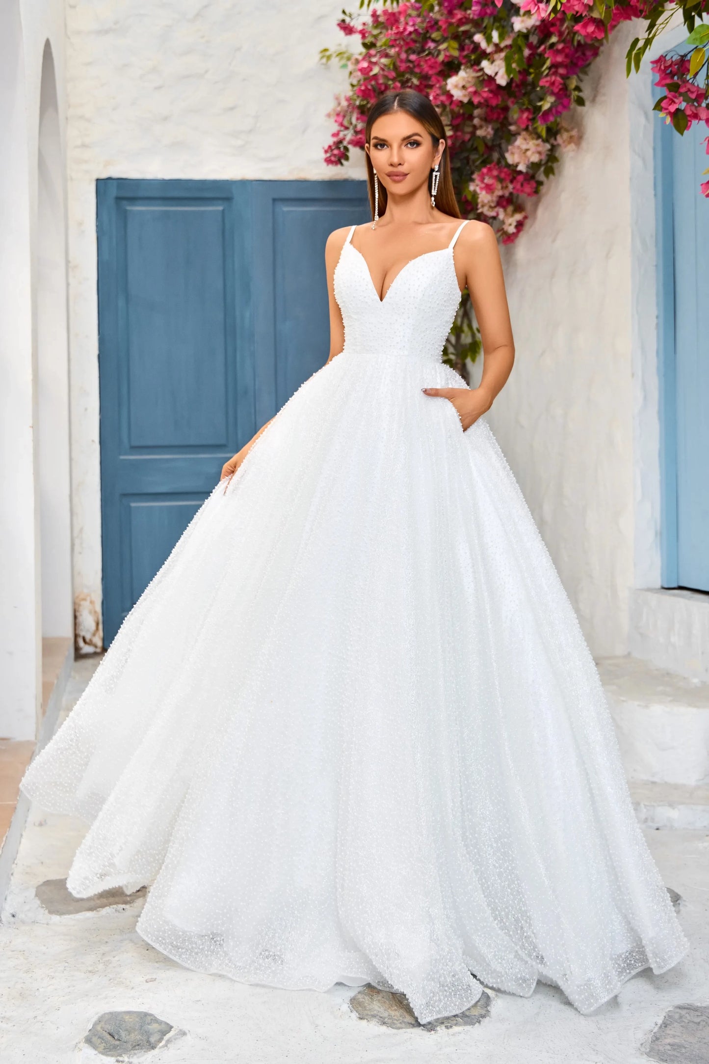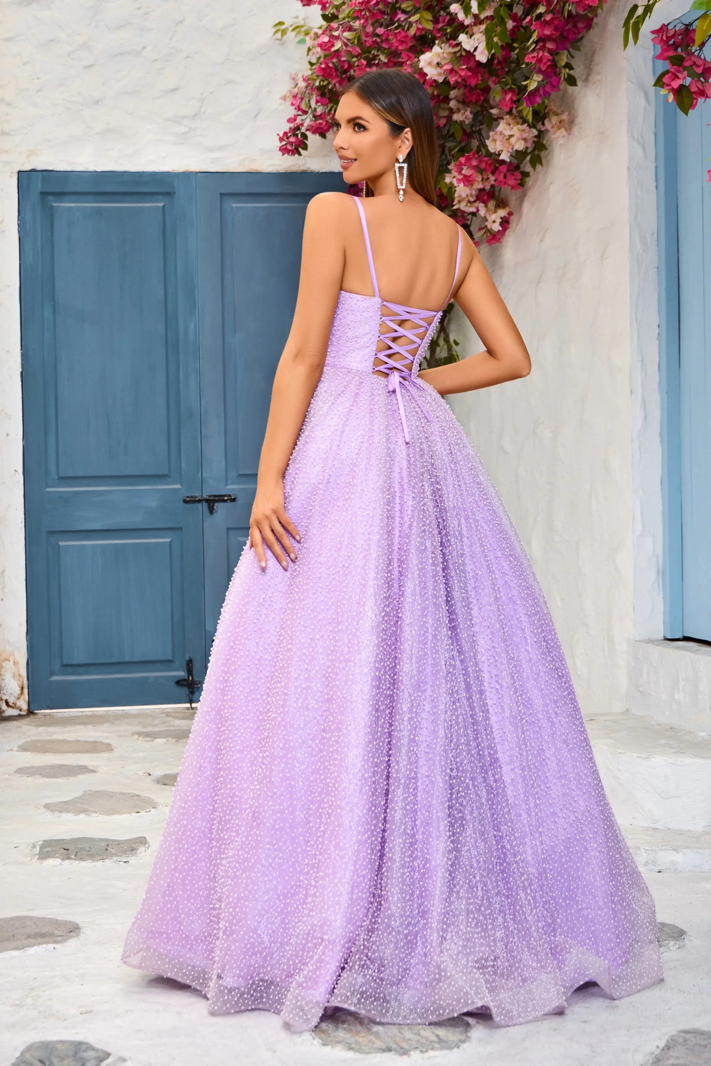 Elevate your special occasion with the J25033 dress. Its spaghetti straps and A-line silhouette are elegantly accentuated by a V-neck and corset detail for a figure-flattering fit. Available in lavender, ivory, and blue, this dress exudes luxury and sophistication.