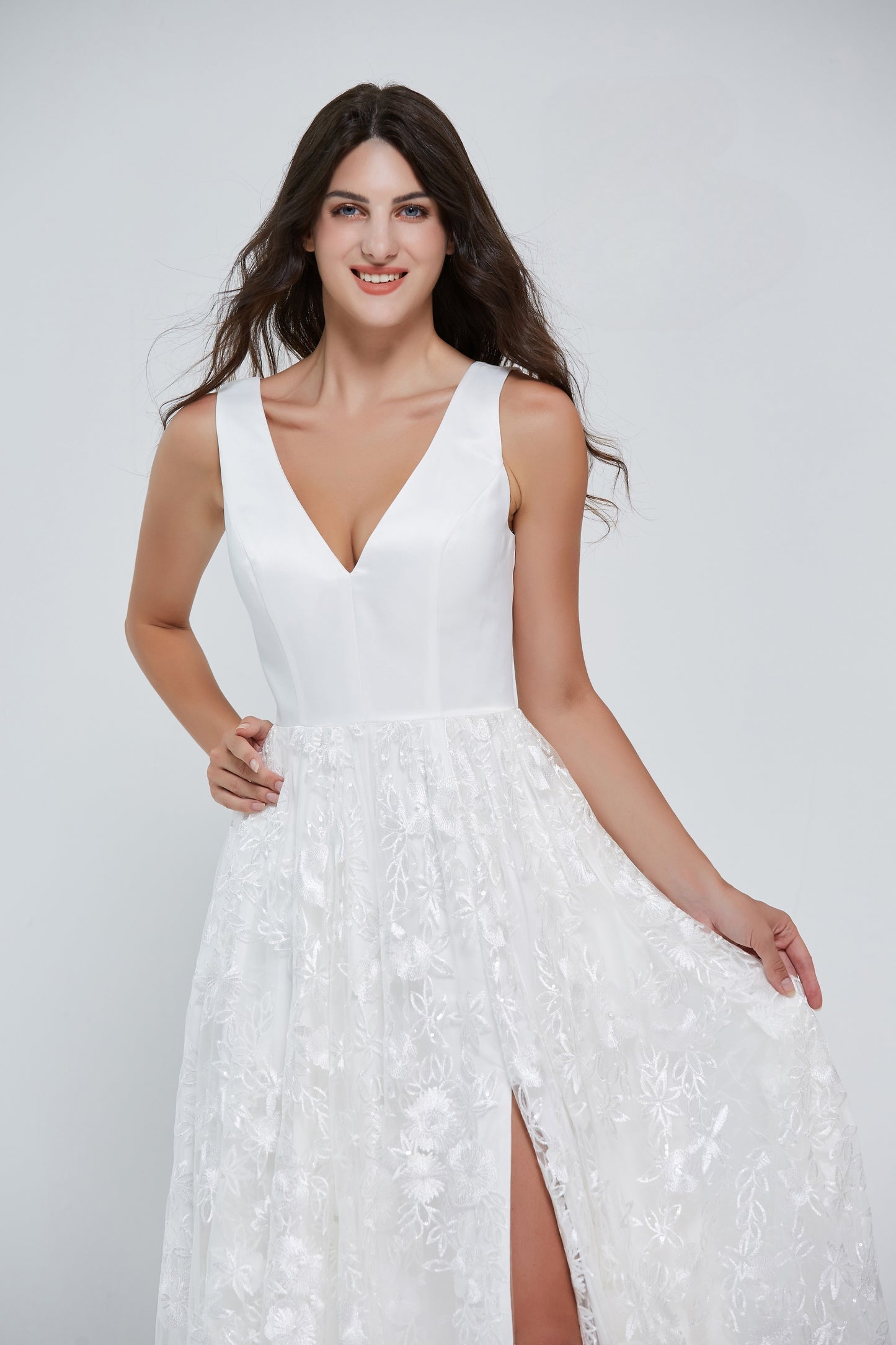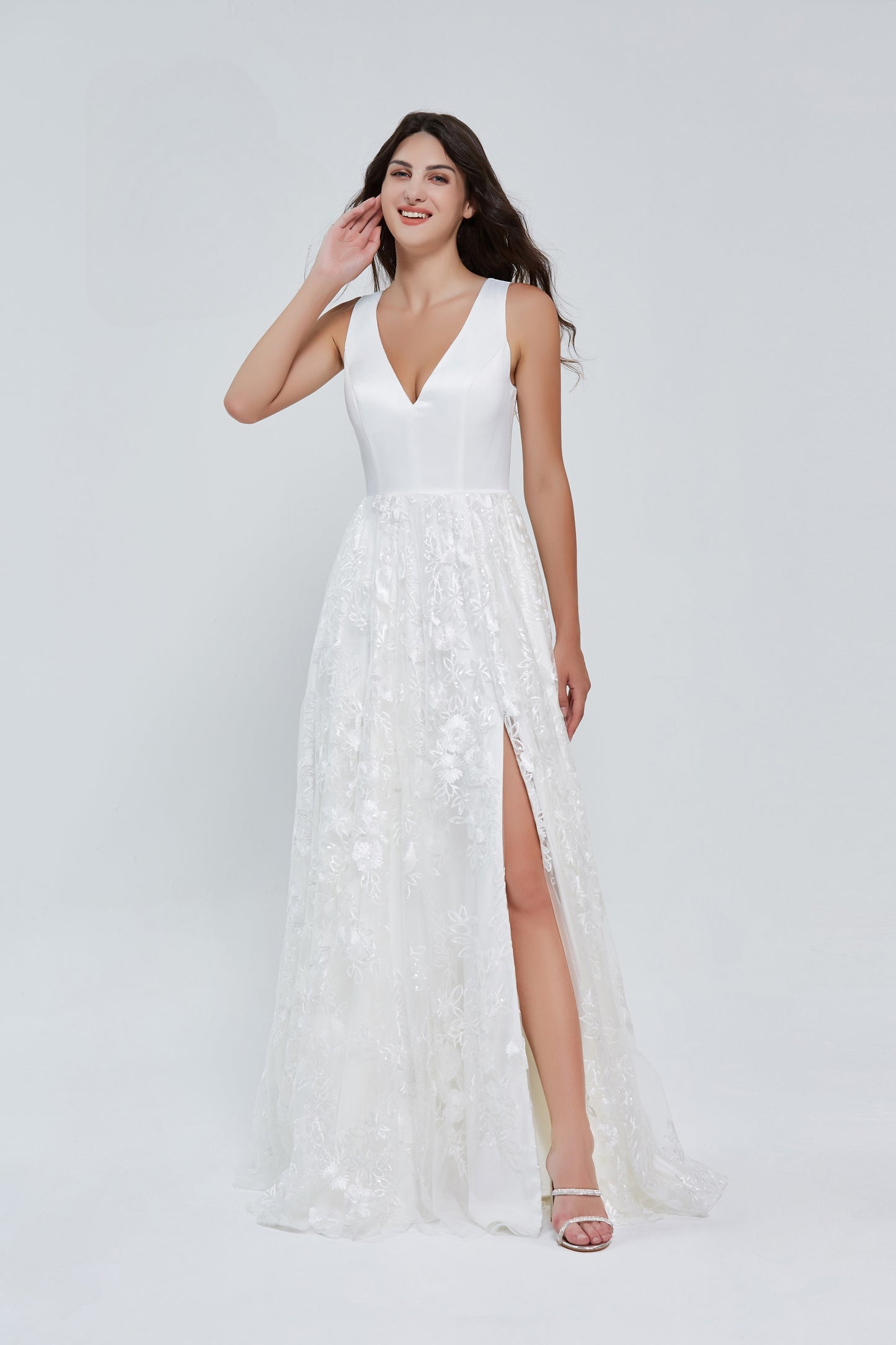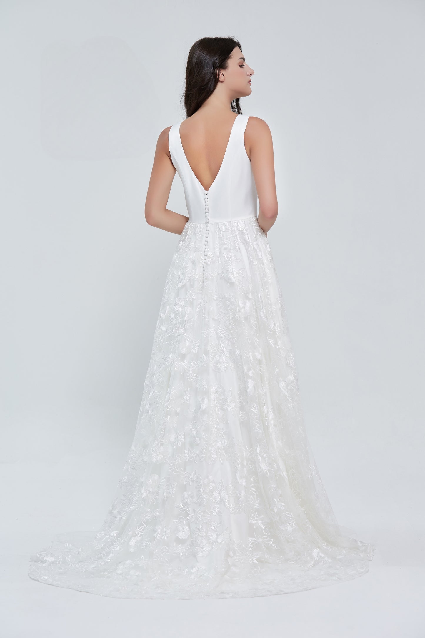 Elevate your special day with JA2002, a dreamy wedding dress featuring a V-neck, floor-length silhouette, and delicate straps. The A-line design flatters your figure, while button details add a touch of sophistication. Make a statement of grace and effortless elegance with this breathtaking gown.
