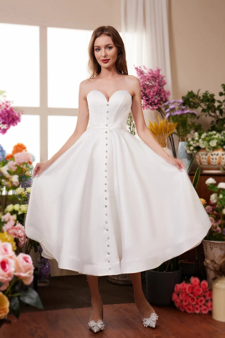 Indulge in pure luxury with our JA4001T wedding dress. This sweetheart, strapless midi dress exudes elegance and sophistication. The luxe ivory fabric adds a touch of opulence, complemented by the A-line silhouette and convenient pockets. Feel like royalty on your special day.