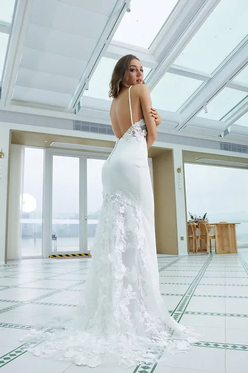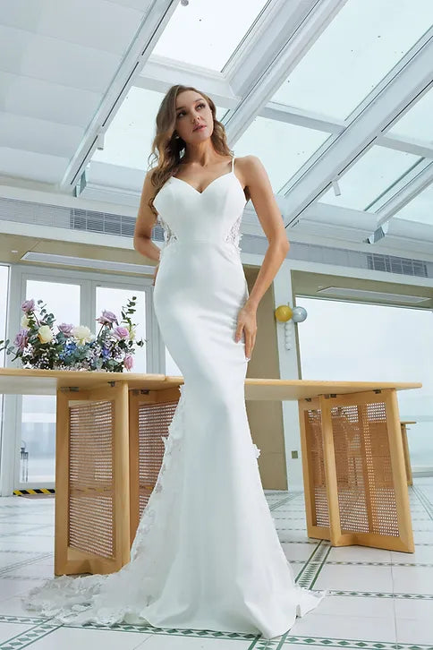 Introducing JA5007, the epitome of luxury. With its siren line design and delicate spaghetti straps, this ivory wedding dress exudes elegance and sophistication. The V-neck adds a touch of sensuality, making this gown perfect for any bride who wants to feel like a true goddess on her special day. Embrace the luxe and elevate your wedding with JA5007.