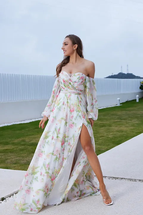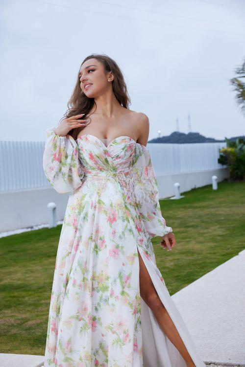 Unleash the elegance and luxury of JA5015 - a one-of-a-kind wedding dress featuring a strapless A-line design. With intricate floral print and delicate long sleeves, this luxe gown will leave you feeling effortlessly beautiful on your special day. Make an unforgettable statement with JA5015.