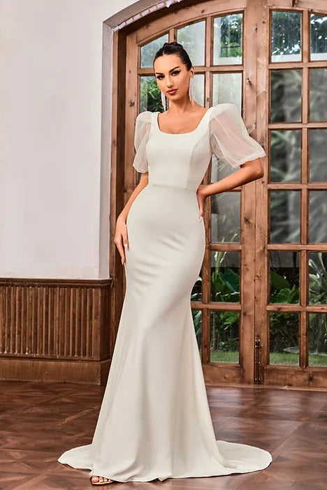 Indulge in the luxurious charm of the JA6006 wedding dress. With a siren silhouette and 3/4 sleeves, this dress exudes elegance and sophistication. The ivory hue adds a touch of luxury while the luxe fabric drapes beautifully, making you the center of attention on your special day.