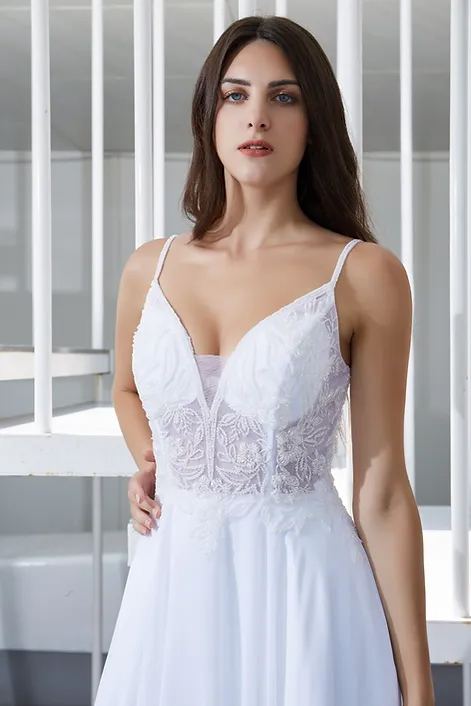 Elevate your wedding day look with our JE603 dress. The V-Neck and spaghetti straps create a luxe and elegant aesthetic, while the A-Line silhouette flatters every figure. The ivory hue adds a touch of sophistication to this must-have piece. Make a statement on your special day with JE603.