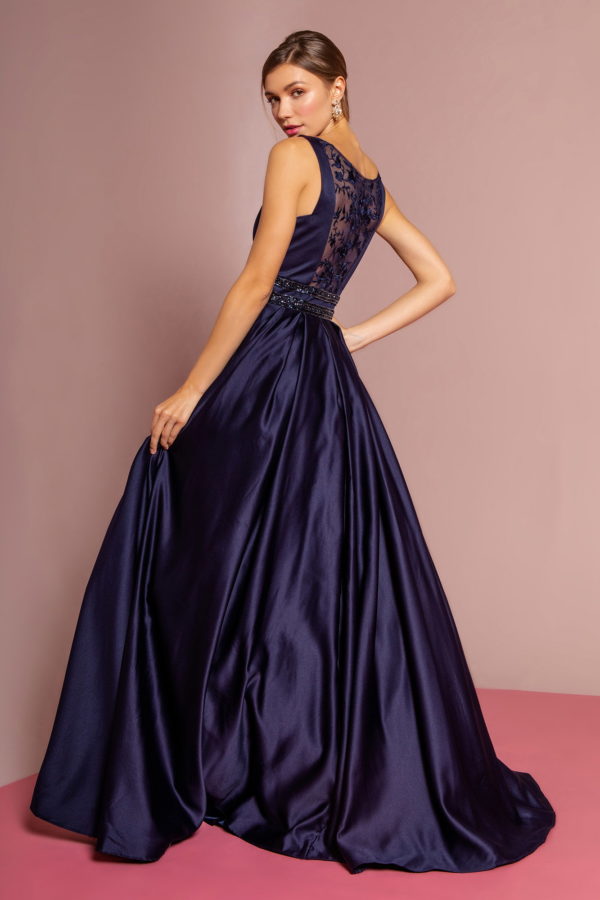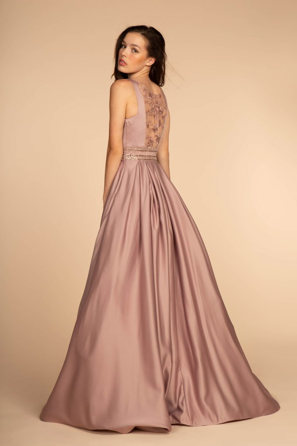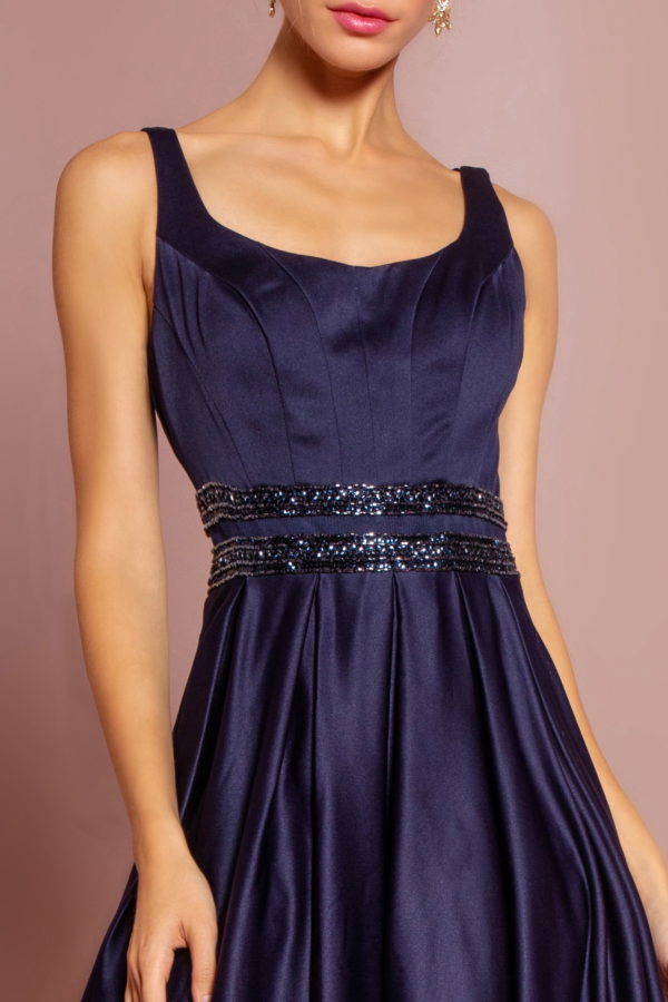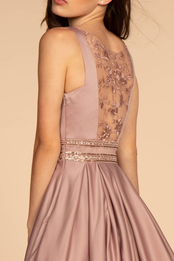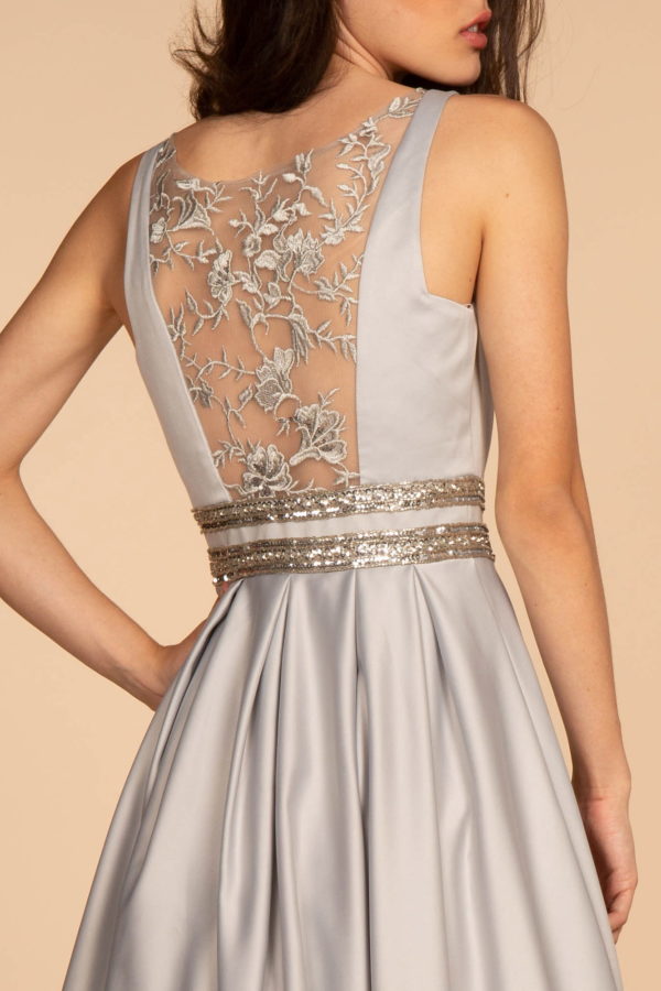 Scoop-Neck Satin A-Line Dress with Sheer Back Gorgeous A-line dress, made of satin, which is glossy and lustrous fabric that drapes beautifully over the body. The waistline is embellished with sparkly beads, and it cinch the waist so you can have a flattering figure. The sheer back is decorated with delicate floral embroidery to embrace a feminine vibe.