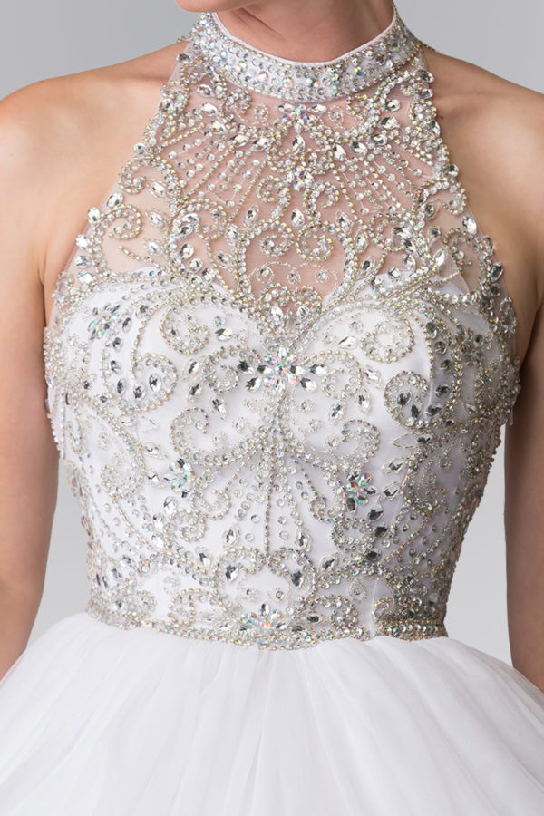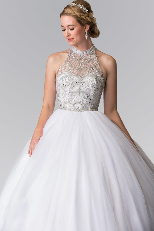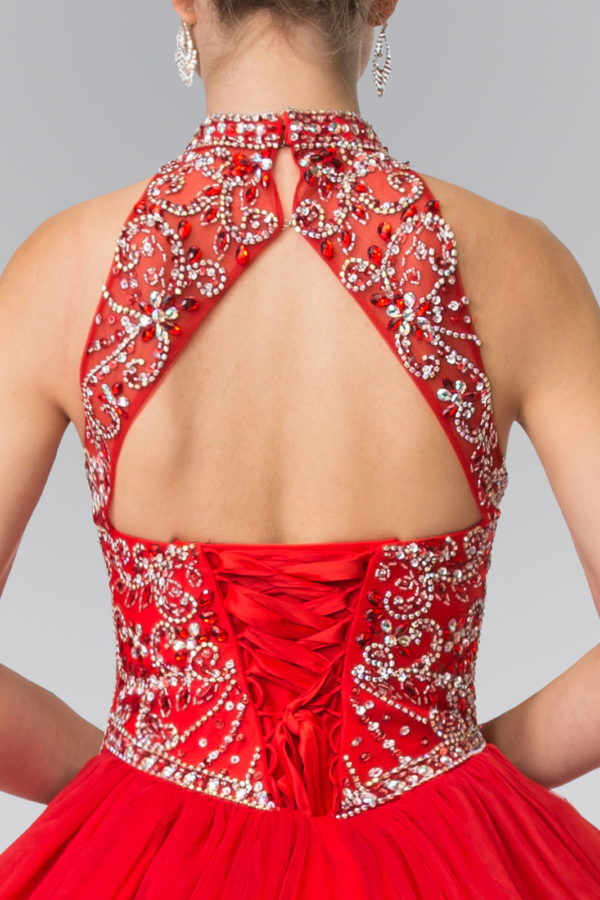 Mesh High Neck Quinceanera Dress with Beaded Bodice and Corset Back