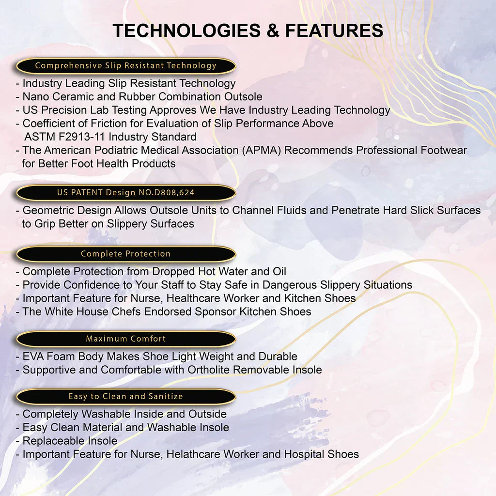 • Women Beautiful Designed Professional Slip Resistant Clogs Made per ASTM Industry Standard, and the American Podiatric Medical Association Recommend Professional Footwear for Better Foot Health Products.